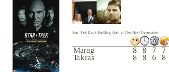 Kveldens andre spill var også nytt, og det ble kjøpt inn kun på grunnlag av temaet alene. Star Trek! The Deck Building Game. Dette er lagt opp akkurat som Dominion, men det har fått nye egenskaper og muligheter som gjør spillet mer interessant og ikke fullt så tørt. Men det skal allerede sies, at om du ikke liker Star Trek, så er ikke dette for deg, fordi kortene alle er tematisk bygget opp med en haug med unike karakterer og egenskaper som er tilpasset deres rolle i TV-serien.