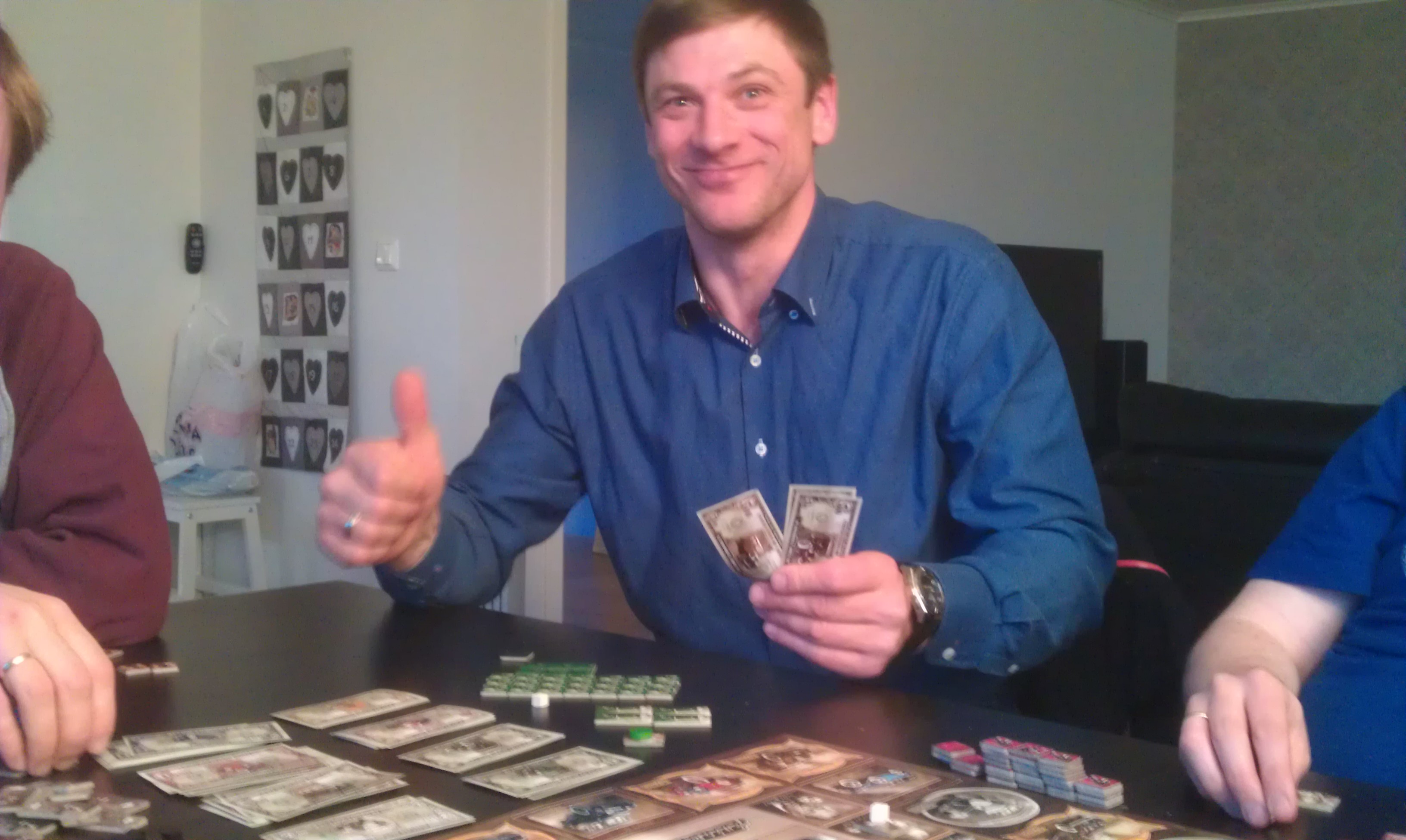 De fleste gikk hjem, mens Peter og Sveinmain tok en runde DiceTown. Ingen av oss hadde spilt det med 2 spillere før, og Peter tok kommandoen fra start og ble sheriff, og fikk dermed fordel i alle delte dueller, og de ble det en del av med 2 spillere. Men det kostet, såpass at han gikk tom for penger. Dermed kunne Sveinmain snu kursen og ta makten tilbake i byen, og Sheriffen. Peter slo tilbake med dobbel gullutbetaling og ingen visste helt hvordan det gikk. Sveinmain sikret seg sheriffen i nest siste runde igjen og hadde behold sheriffen kortet hvis du mister tittelen i siste runde. Peter satset alt på sheriff og 5 viktige poeng, og ble litt lang i maska da Sveinmain beholdt han likevel. Det ble en knusende seier til Sveinmain denne gangen 55 mot 35, i et spill som fungerte overraskende godt for 2 spillere.