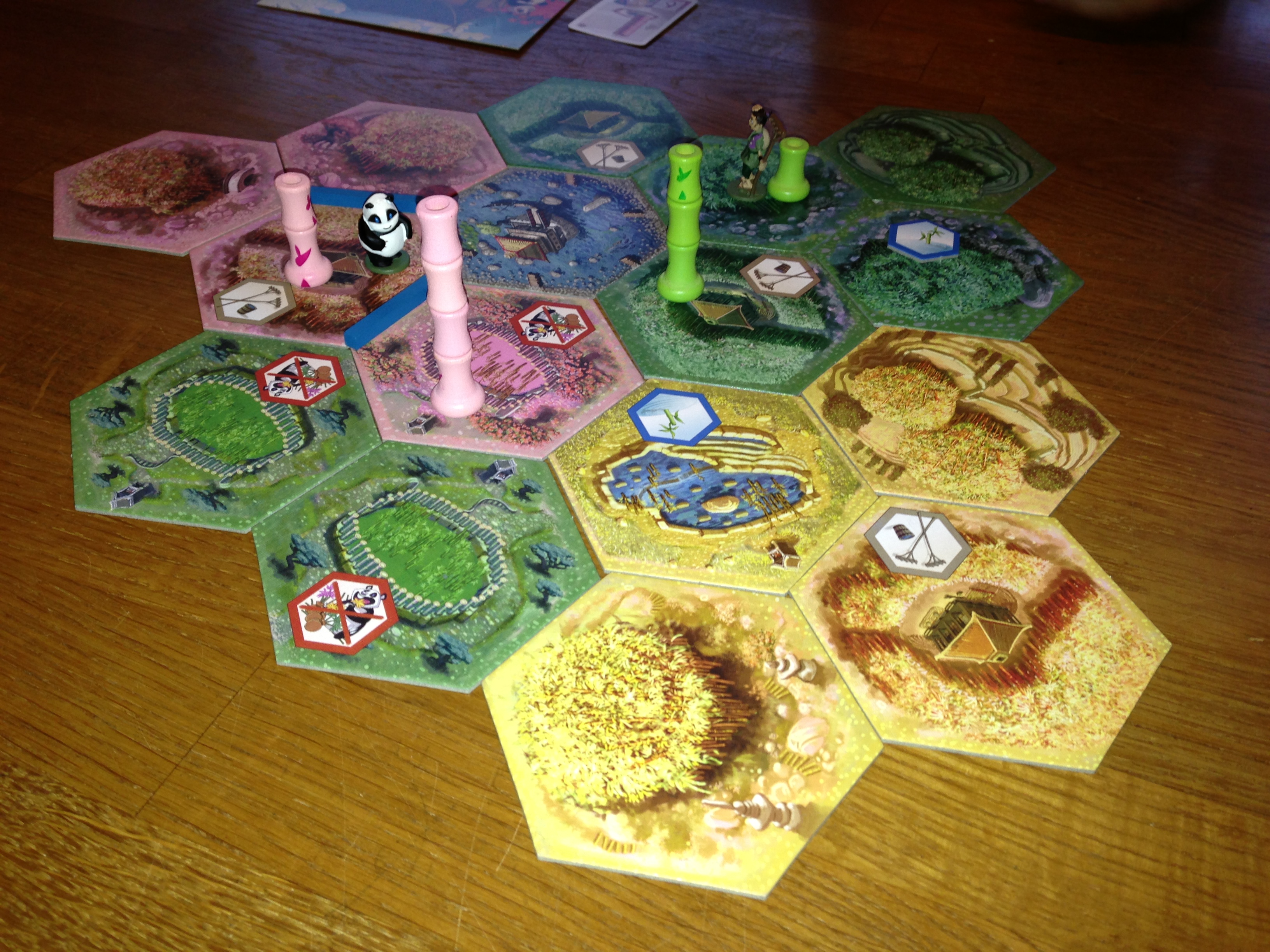 Etterpå ble det en runde med det sukkersøte spillet Takenoko. Takras har hatt dette med veldig ofte, men det blir aldri spilt. Kanskje fordi forsiden av spillet består av mange lyse farger – deriblant rosa – og en søt liten panda med paraply? Det får forbli et mysterie. Alfred, Oscar, Takras og Hollender fikk hver sine oppdragskort og rundene gikk lynraskt unna. Vi begrenset oss til 5 oppdragskort før vi ble ferdige, og det tok ikke lange tiden. Alfred hadde skjønt dette tidlig, og Oscar med. Og i kjent stil kom det mange spørsmål fra Hollender i et spill som har enkle regler. Takras overrasket med 3 kjappe oppdrag og avsluttet spillet, men de andre fikk en siste handling. Hollender klarte også 5 oppdrag like etterpå og overrasket like stort, men hadde mye mindre poeng. Oscar og Alfred hadde også en del poeng på lur, så denne runden løsnet alt sammen for alle. Det ble tie-breaker på 21 poeng mellom Oscar og Takras, hvor Takras hadde flest panda-poeng og gikk bort med seieren.