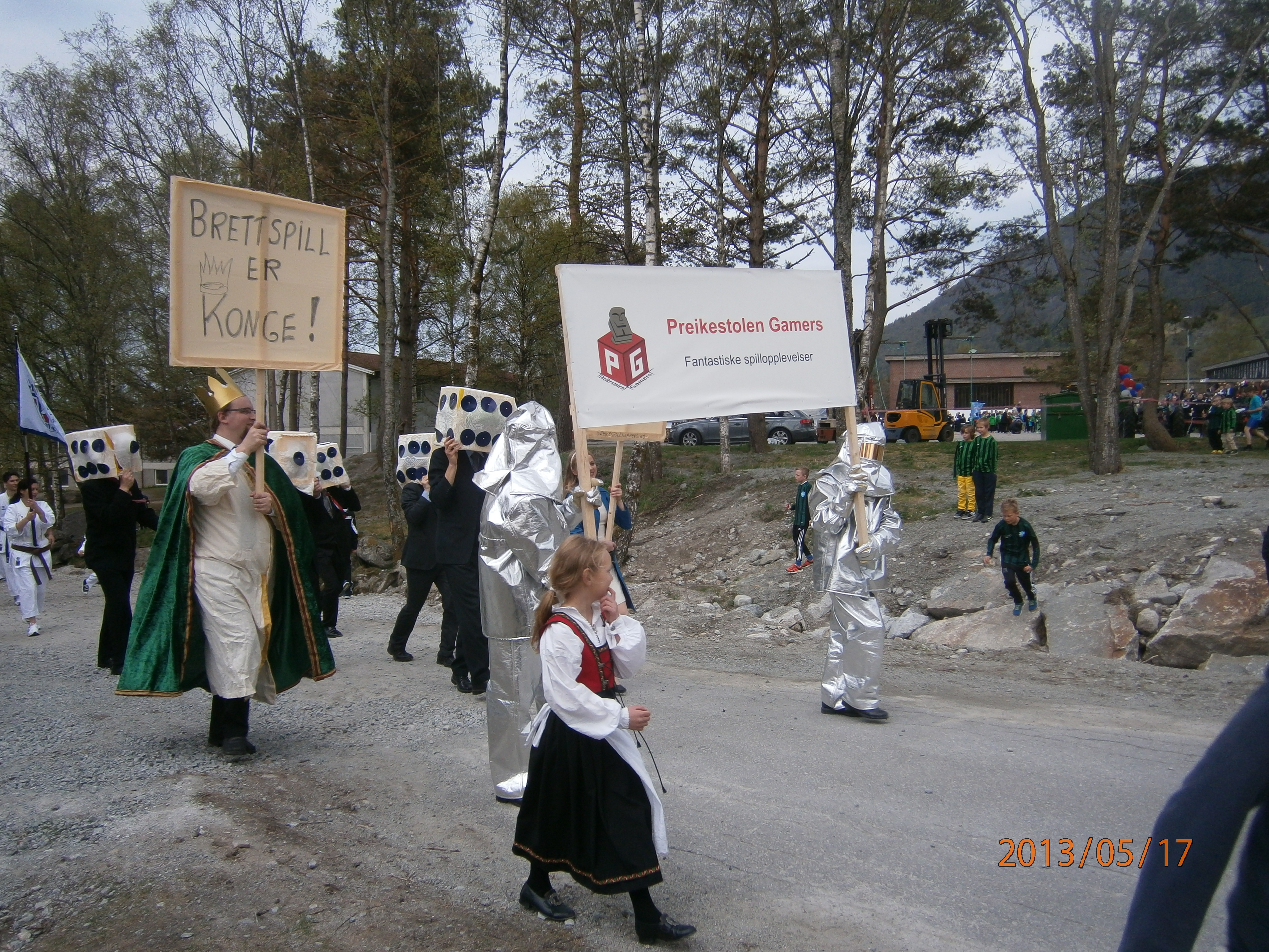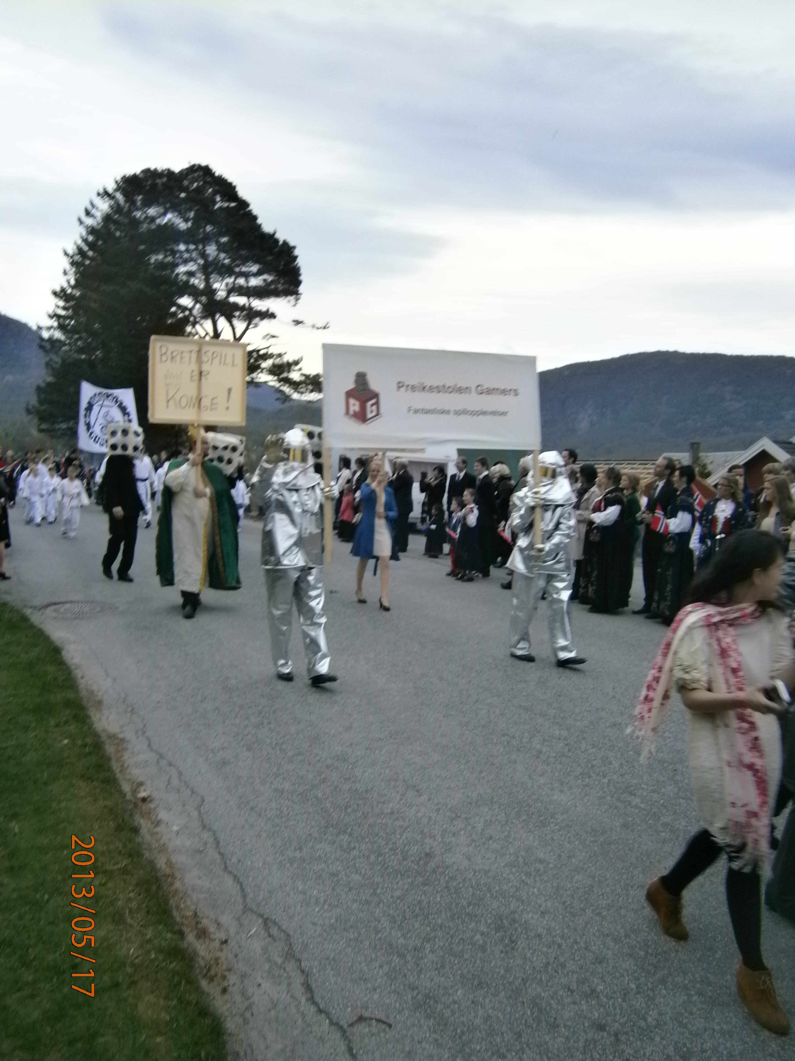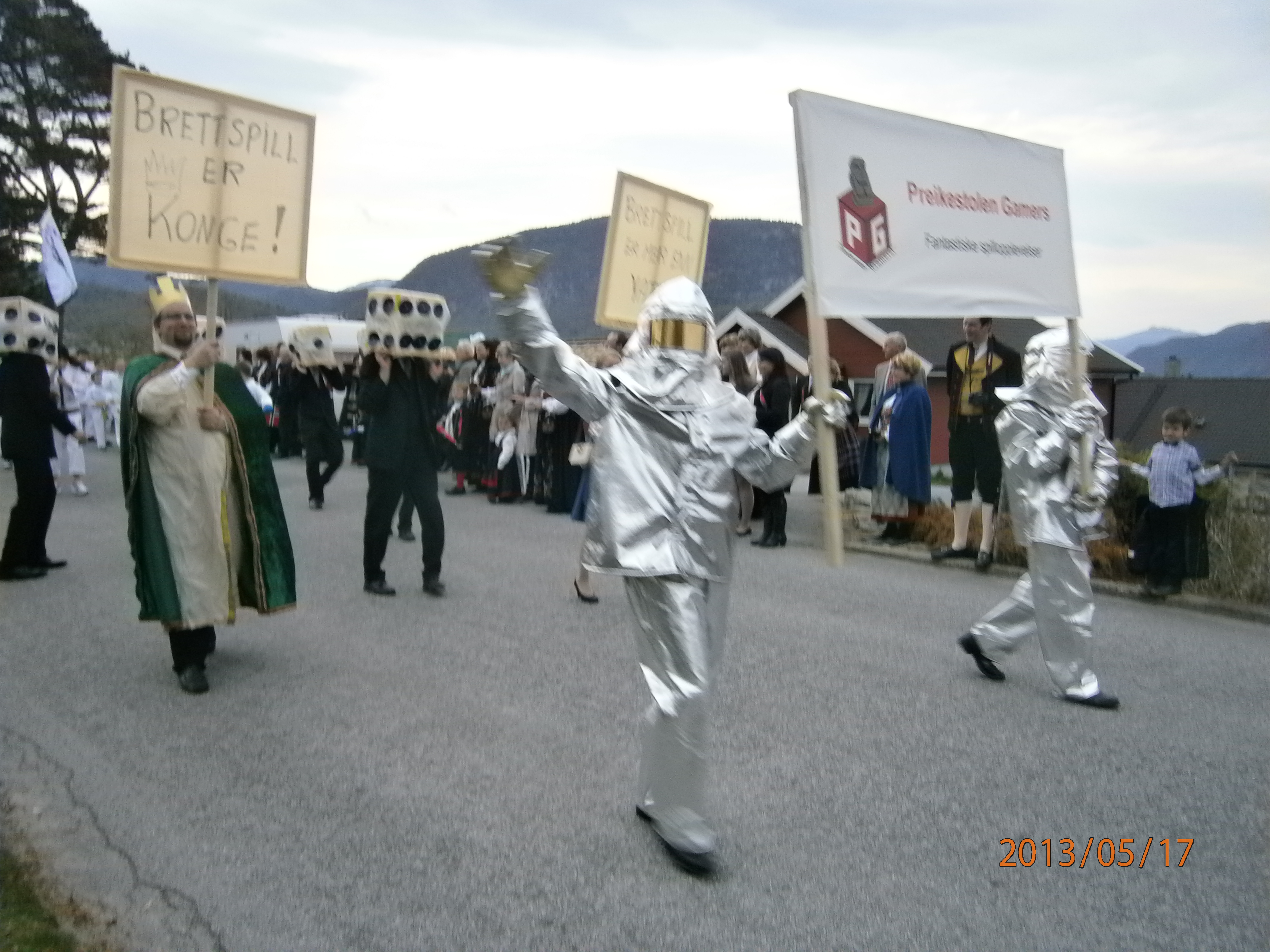 Hvis kassen var terninger ville folk kjenne seg igjen. Sveinmain lovet å lage en prototyp. Så ble paroler ble laget og sanger skulle skrives. Å lage Pet Shop kasser skulle vise seg å være vanskeligere enn først antatt, men en tom bruskasse reddet det hele. Gjennomsiktige gardiner ble kjøpt inn på Fretex, voksduk ble prikker på terningen, og et dusjforheng gjorde seg som plakater i tilfelle regn. Supersnekker Saulius lagde rammer til det og banneret vårt, og Marog fant frem kongekostymen sin fra Lancasterinnspillingen med Takras. Ant fant frem varmeskjolddrakter, eller svettedrakter som det ble, og Peter fikset kongekrone og sang. Ideen ble spredd og folk gikk mann av huse for å være med. 9 roller var tiltenkt og 9 stk ble vi! Dermed var det bare å gjennomføre. Men så var det sangen da! Det viste seg umulig å synge uinnøvde sanger med kostymer på hodet, så da ble det heller terningtrilling og Do they know its boardgametime at all i stedet! Knut dro opp med dansing og samba-bevegelser da korpset gikk like foran oss, og vi andre hev oss på etter beste evne. Det ble et paradetog med mye latter og smil langs løypa, noe som inspirerte til mer dansing og terningtrilling. Yatzy, stor stright, liten stright og hus ble laget underveis og ikke minst fygaren – armene ut som fly uten å holde kassen – et C moment. Til og med våre største skeptikere (de PG er gifte med) roste innslaget. Fremme på stevneplassen var vi så svette og slitne en aldri har vært i noe 17. mai tog noen gang. Men moro var det, selv om 17. mai komiteen var korrupt og nektet å gi oss seieren for beste innslag. Føler vi vant publikumsprisen, for makan tilbakemelding skal en lete lenge etter. En 6er på terningen fra kjente og ukjente, varmet et spillhjerte. Bare ett år til neste gang:-) Tusen takk til alle som var med: Robert, Black Ant, Linn, Marog, Hollender, Knut, Saulius, Peter og Sveinmain.