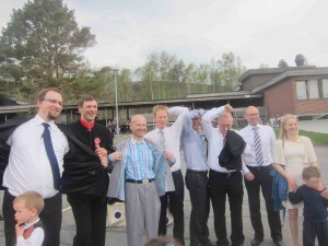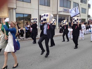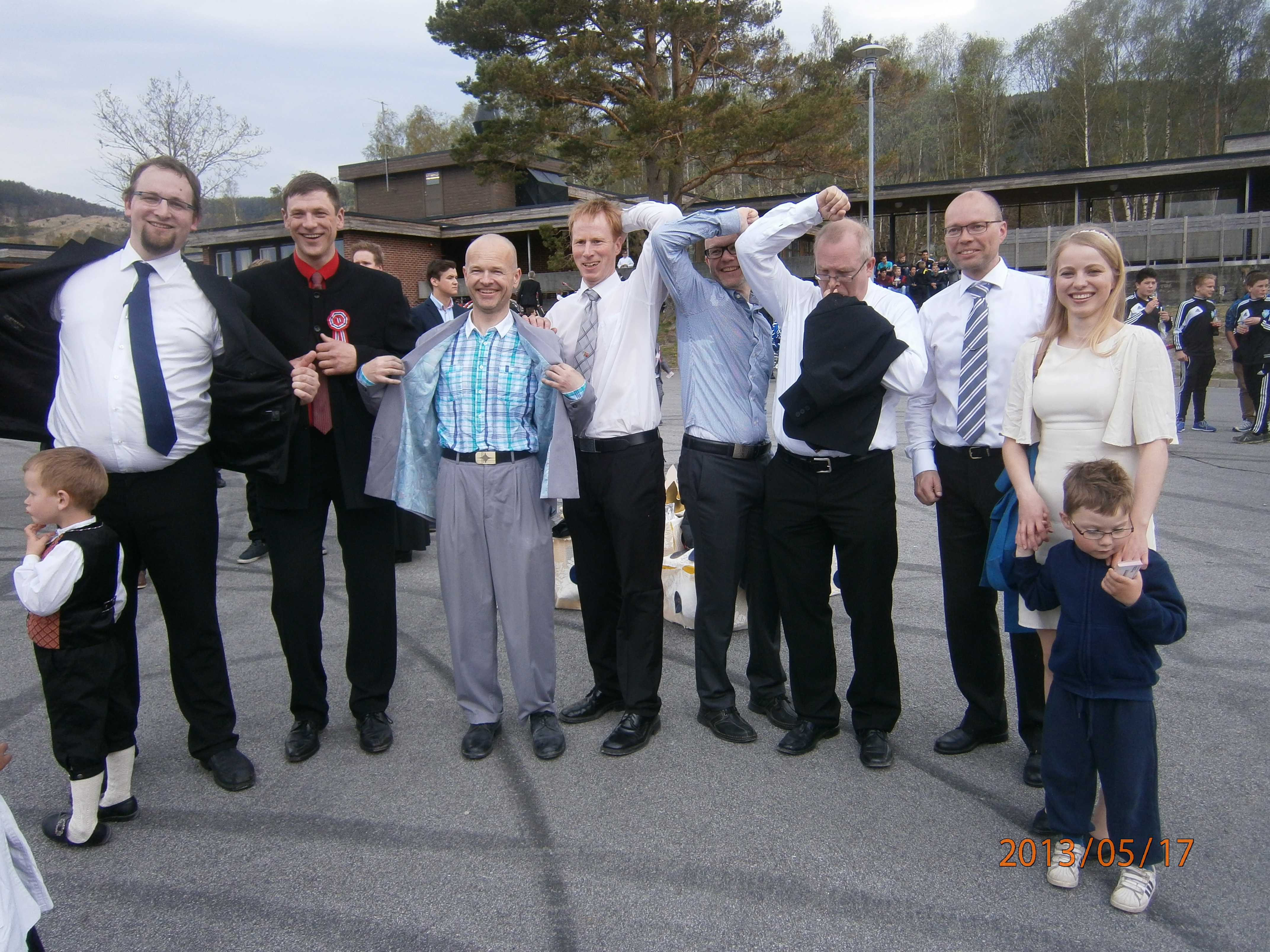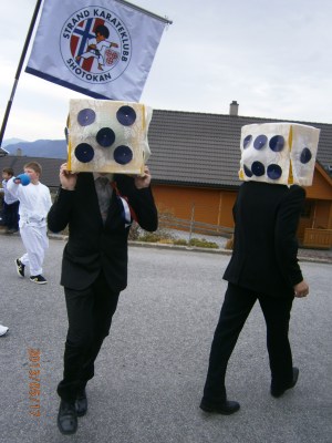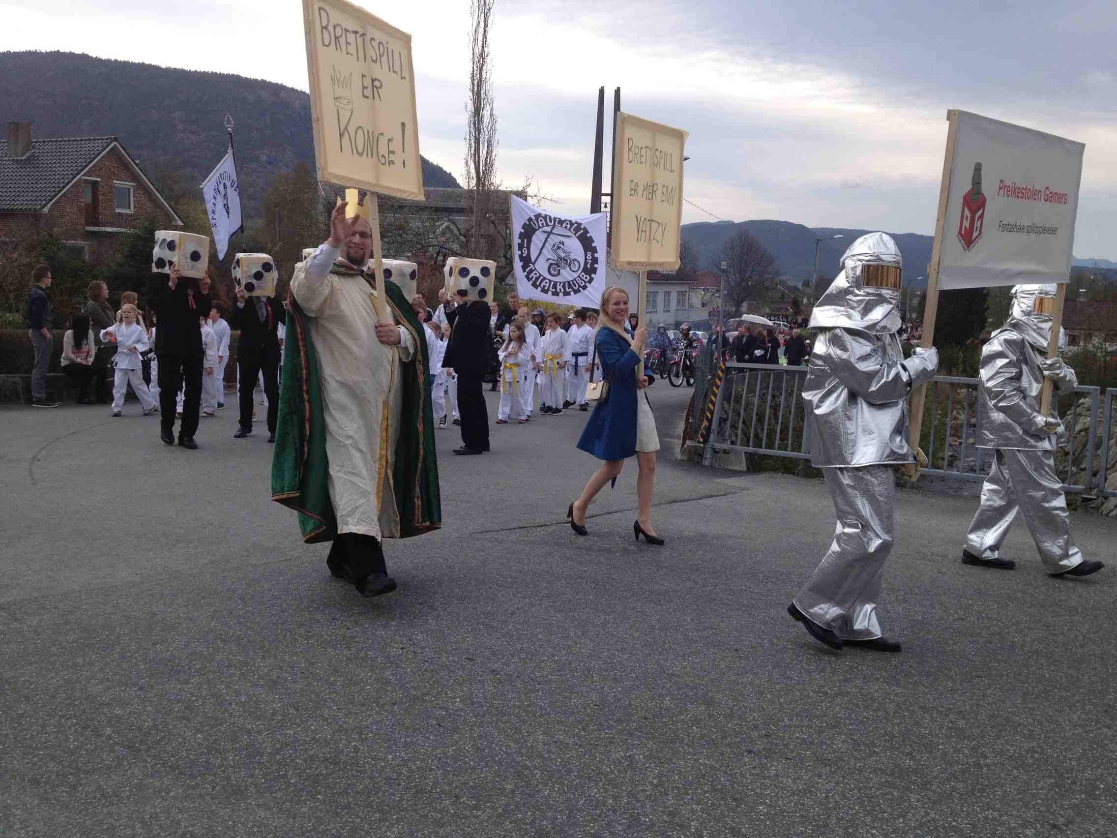 Hvis kassen var terninger ville folk kjenne seg igjen. Sveinmain lovet å lage en prototyp. Så ble paroler ble laget og sanger skulle skrives. Å lage Pet Shop kasser skulle vise seg å være vanskeligere enn først antatt, men en tom bruskasse reddet det hele. Gjennomsiktige gardiner ble kjøpt inn på Fretex, voksduk ble prikker på terningen, og et dusjforheng gjorde seg som plakater i tilfelle regn. Supersnekker Saulius lagde rammer til det og banneret vårt, og Marog fant frem kongekostymen sin fra Lancasterinnspillingen med Takras. Ant fant frem varmeskjolddrakter, eller svettedrakter som det ble, og Peter fikset kongekrone og sang. Ideen ble spredd og folk gikk mann av huse for å være med. 9 roller var tiltenkt og 9 stk ble vi! Dermed var det bare å gjennomføre. Men så var det sangen da! Det viste seg umulig å synge uinnøvde sanger med kostymer på hodet, så da ble det heller terningtrilling og Do they know its boardgametime at all i stedet! Knut dro opp med dansing og samba-bevegelser da korpset gikk like foran oss, og vi andre hev oss på etter beste evne. Det ble et paradetog med mye latter og smil langs løypa, noe som inspirerte til mer dansing og terningtrilling. Yatzy, stor stright, liten stright og hus ble laget underveis og ikke minst fygaren – armene ut som fly uten å holde kassen – et C moment. Til og med våre største skeptikere (de PG er gifte med) roste innslaget. Fremme på stevneplassen var vi så svette og slitne en aldri har vært i noe 17. mai tog noen gang. Men moro var det, selv om 17. mai komiteen var korrupt og nektet å gi oss seieren for beste innslag. Føler vi vant publikumsprisen, for makan tilbakemelding skal en lete lenge etter. En 6er på terningen fra kjente og ukjente, varmet et spillhjerte. Bare ett år til neste gang:-) Tusen takk til alle som var med: Robert, Black Ant, Linn, Marog, Hollender, Knut, Saulius, Peter og Sveinmain.