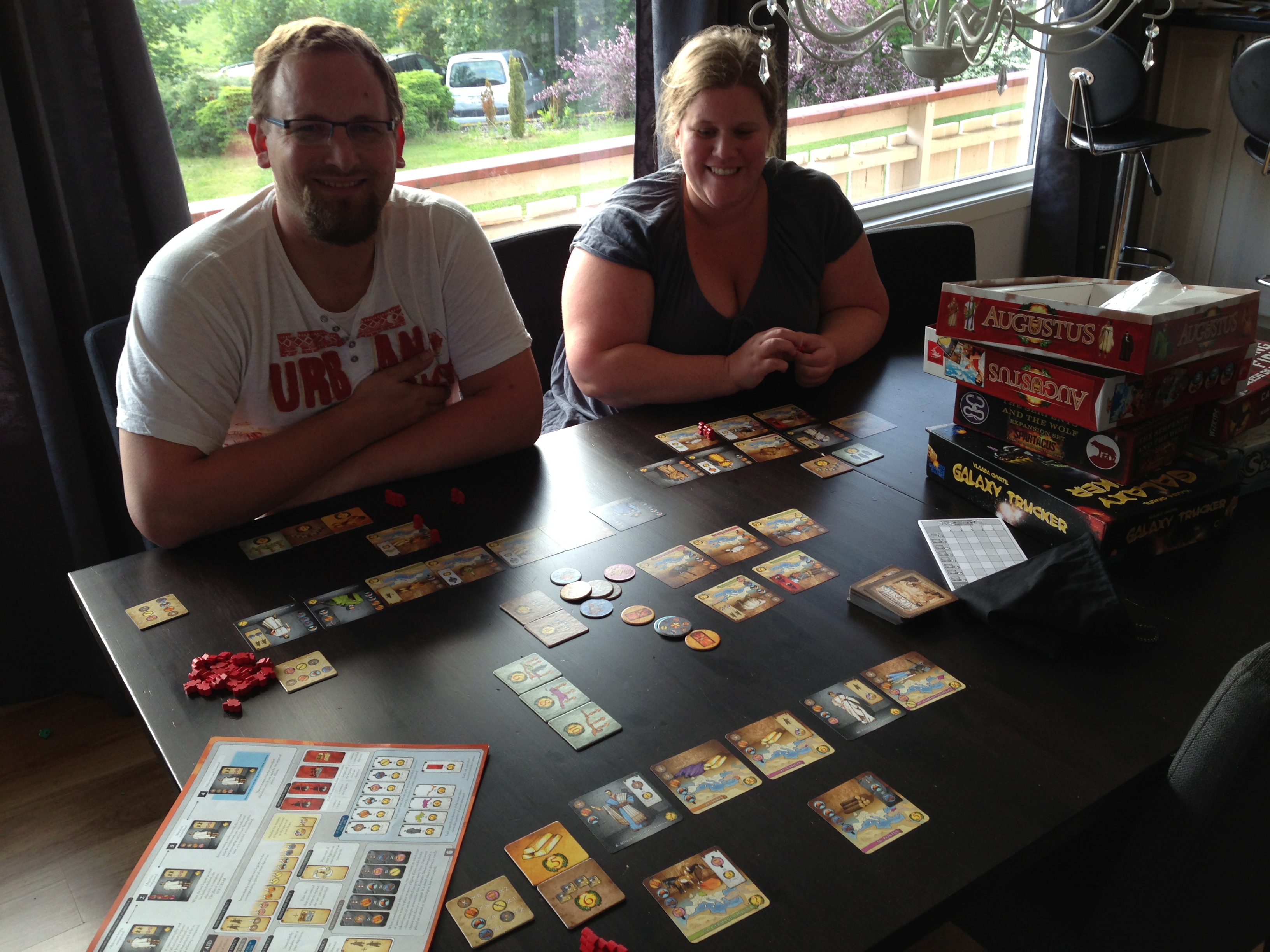 Men før klokka slo 20, ble Augustus funnet frem og spilt mens vi ventet på flere. Marog fikk en ekstra leginær fra første «Ave Caesar» og hadde dermed en fordel fra starten. Kaoleena og Takras måtte stadig flytte på legionærer mellom kortene, slik at det sjeldent ble noen fullførte fra dem. Gullet vekslet hånd et par ganger, mens hveten holdt seg på ett sted. Marog sikret seg en farge av hver + et senatmedlem og i tillegg 6 oppdragskort-poengene. Etter poengtellingen var det liten tvil om hvem som vant, spesielt da Marog hadde 2 kort flere enn resten. Så i tradisjon tro så vinner Marog i spill som er nytt for ham og kona.