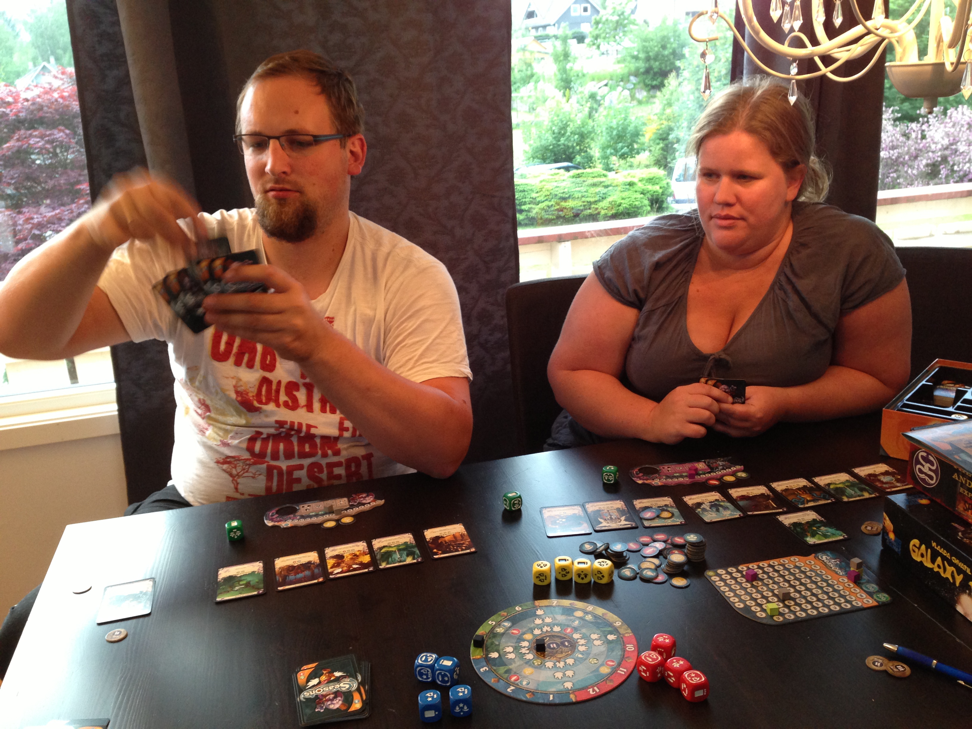 Allerede etter første runde så var alle med på flyten i spillet og forstod hva vi måtte gjøre. Kaoleena satt fast med bare et kort eller to, mens Takras hadde fått fire ganske tidlig, uten at de gjorde særlig nytte. Men å stjele poeng fra andre spillere hver sesongskifte var ingen dum ting for Takras. Spesielt ikke da han får begge kortene og spiller dem ut, allerede i første året. Problemet med slike kort er at de tar plass i din begrensede mengde, og gir ingen bonuser som faktisk gjør nytte. Marog hadde dette og skaffet seg mange krystaller hver runde. Men Kaoleena overrasket en runde og gikk fra 2 kort til 6 kort! Det var skikkelige kombinasjoner hun hadde fått, så plutselig var Kaoleena en sterk deltaker for å vinne spillet. Takras kunne (og burde) ha avsluttet spillet en runde siden han ikke hadde flere kort igjen på hånd, men det gikk altså en ekstra runde. Kaoleena hadde nesten 40 poeng med flest kort i slutten av spillet, men Takras matchet dette i siste liten. Så bar det frem med kalkis og beregne sluttsummen.