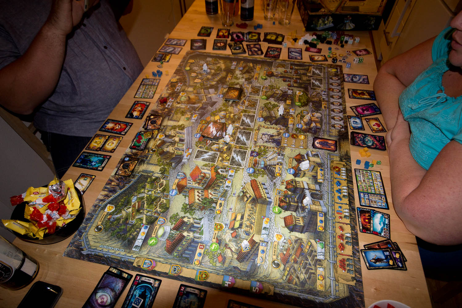 Etter en drøy halvannen time begynte vi endelig å spille. Vi måtte lage noen husregler underveis ut fra det som virket logisk, spesielt tematisk. Egentlig er dette et enkelt spill å forstå, men regelheftet var bare uklart. Dette er et worker placement-spill der vi skal hente inn tapperhetspoeng og gull, i tillegg til å slåss mot monstre i en annen fase i spillet. Spillet er delt opp i 3 faser. 1. Utplassering av arbeidere og krigere. 2. Aktivering av bygg. 3. Slåss mot monstre. I den første fasen skal vi kun sette ut arbeidere på forskjellige bygg. Noen bygg er utilgjengelige avhengig av hvor mange arbeidere som er tilstede. Men vi får ikke brukt bygget ennå. Arbeiderne er en felles ressurs, og hver tur må du velge om du vil sette ut arbeidere, kjøpe hus eller sende ut heltene på eventyr. Timingen her er viktig for å få det du vil. Neste runde er aktivering av bygg, men her er også rekkefølgen viktig, så skal du aktivere et bygg eller bruke turen på å kjøpe noe? Siste fase krevde en hel del med regelleting og geek-søking. Det var ikke alt som var klart.