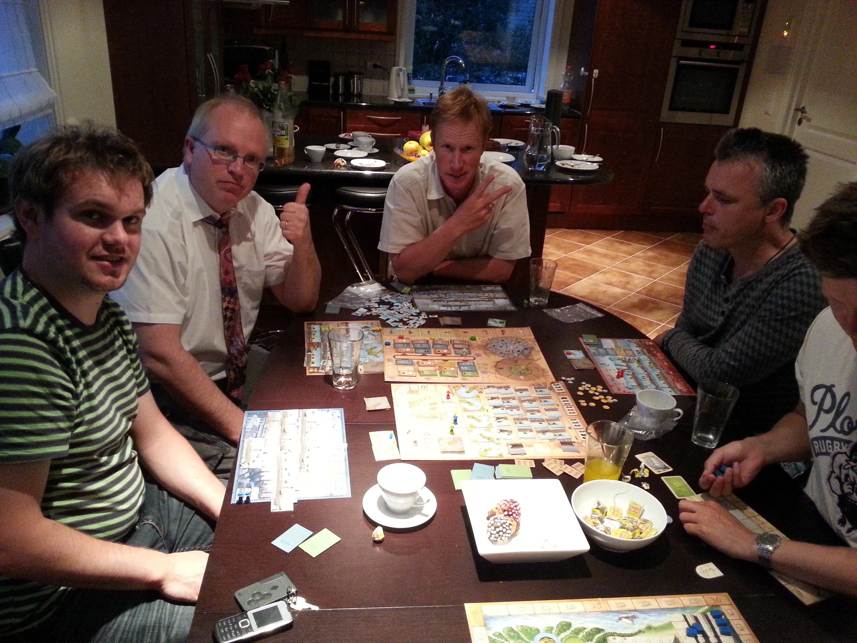Sveinmain hadde forberedt Shipyard – Et roundellspill med hele 6 roundeller på samme brett. Styrmann som skulle hjem tidlig valgte selvsagt dette spillet, sammen Peter og Kim var vi klare for å drive skipsverft på det andre bordet. I Shipyard er det 8 forskjellige handlinger å velge mellom, men en kan kun velge de som ikke er opptatt av andre spillere. Dette gav hver spiller 4 mulige valg i hver runde. Det kunne være å kjøpe båtdeler, hyre mannskap, skaffe utstyr, låne en fjord for testing av båt, eller få subsidier, få inn et tog med utstyr, eller selge toglaster for mannskap og utstyr. Altså mye å holde styr på til en hver tid. Alle prøvde etter beste evne å utstyre båtene med seil, damp, propeller, utstyr og mannskap som passet med båten og som også passet med et av sine 2 hemmelige oppdrag en sitter igjen med på slutten av spillet. Men det måtte mange handlinger til å få et skip seilings