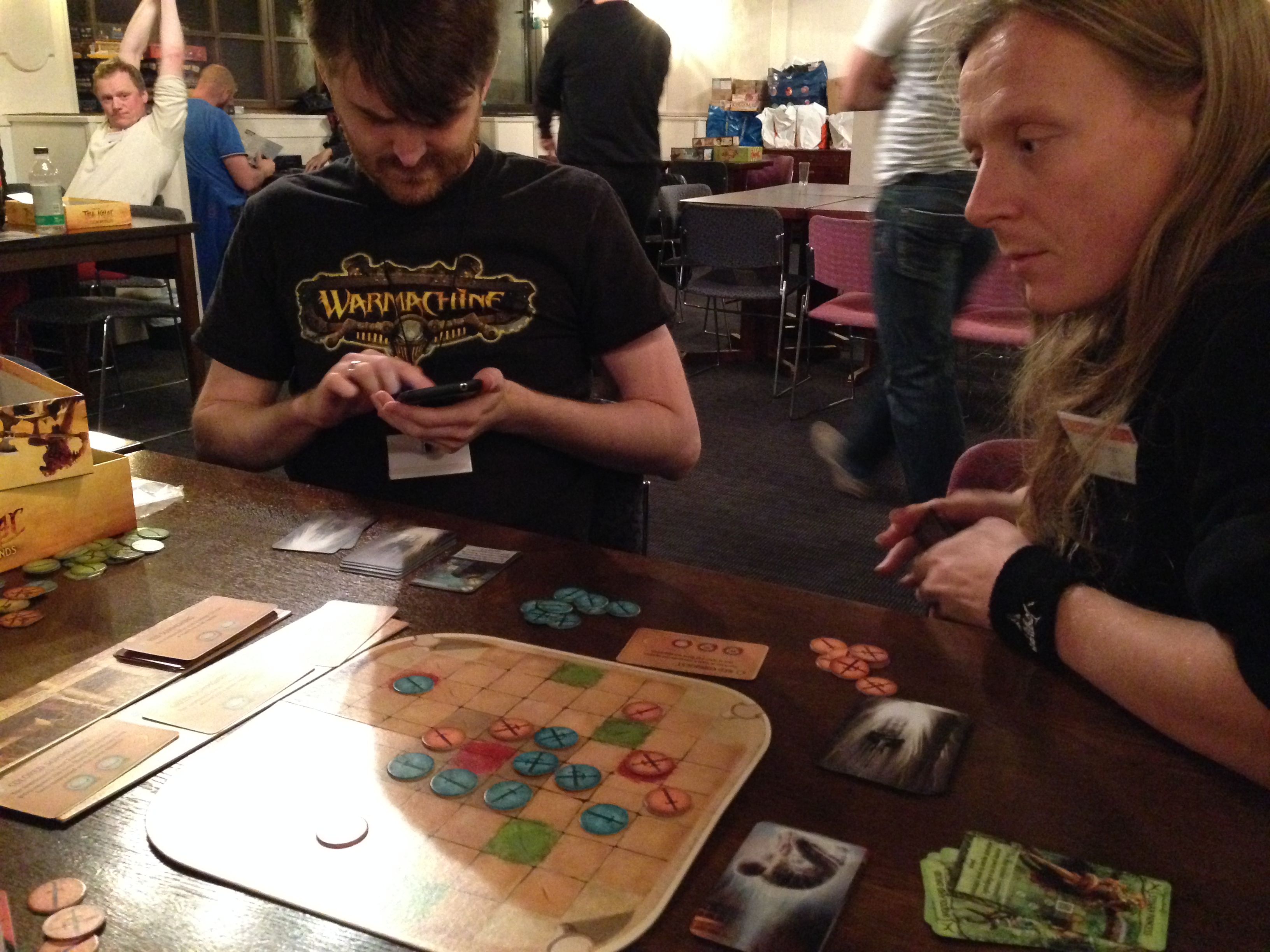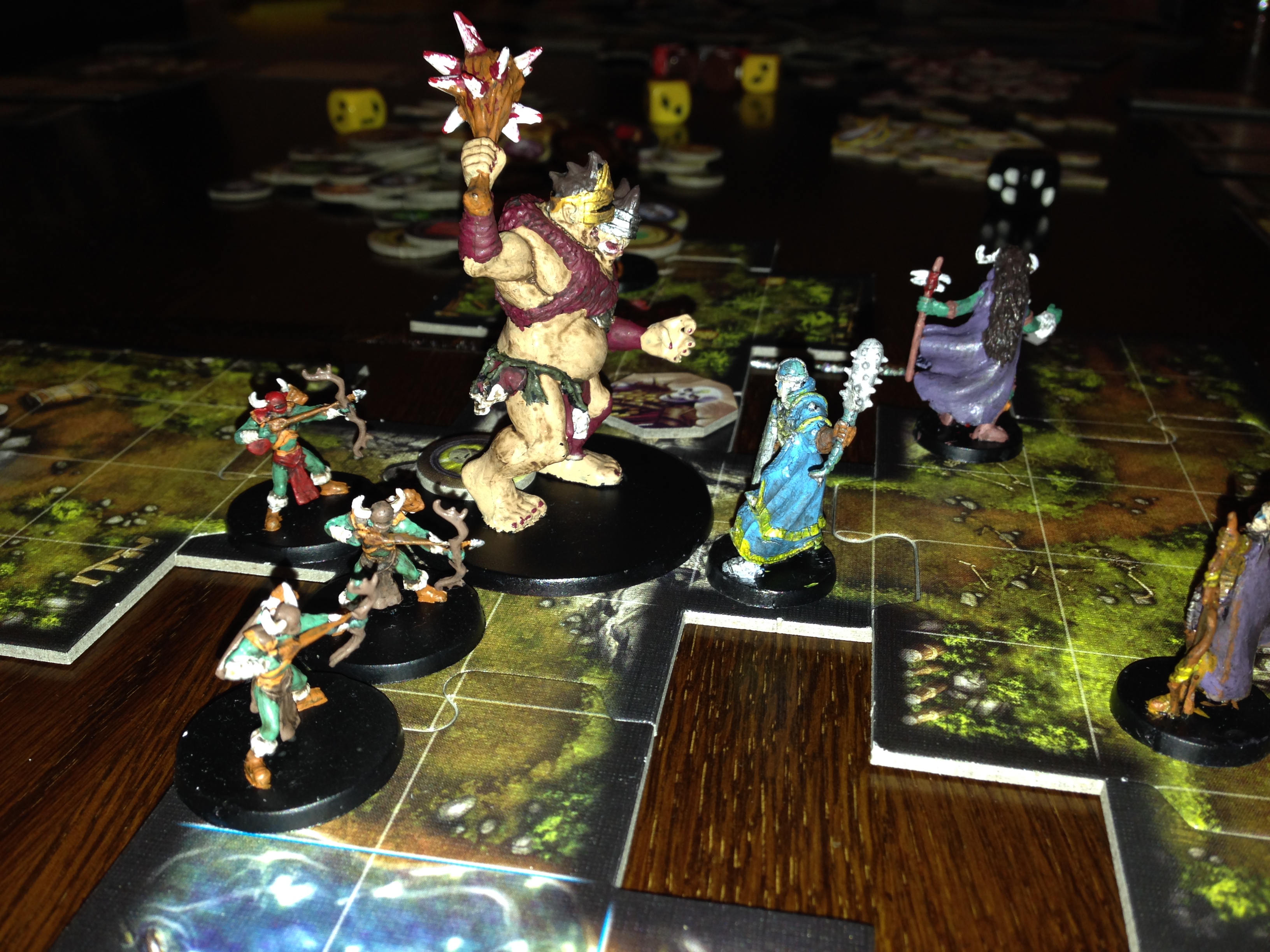 Descent (2nd. edition). Dette var planlagt lenge i forkant. Skillz var med og Bjarte var med. Vi lokket til oss Artefact også, som var interessert i det. Her er det alle mot én, hvor han ene spiller The Overlord, som styrer monstrene og skal hindre heltene i å klare sitt oppdrag. Vi feide unna introduksjonskapitlet og de klarte seg ganske greit mot meg, som glemte at mine minions hadde double move. Vi avsluttet og fortsatte neste dag. Denne gangen måtte Artefact trekke seg ut og lot … Jone(?) ta hans plass. Dette er et skikkelig gøy spill, både for heltene og for the Overlord som jeg spilte. Det er spennende å skje hvordan ting går med terninger og hvordan heltenes plan går imot mine egne. De vet heldigvis ikke hvilke kort jeg har tilgjengelig på hånd, og det er egentlig den eneste fordelen jeg har som gjør at jeg har mulighet til å vinne. Descent er bygget opp til at begge sider må skynde seg for å klare oppdraget, ellers vinner motparten. Så et scenario med to akter tar gjerne et par timer. Stor variasjon i oppdragene og kul historie. Ypperlig spill. Og mange tilskuere kom og så på figurene jeg hadde malt; det var jo litt artig.