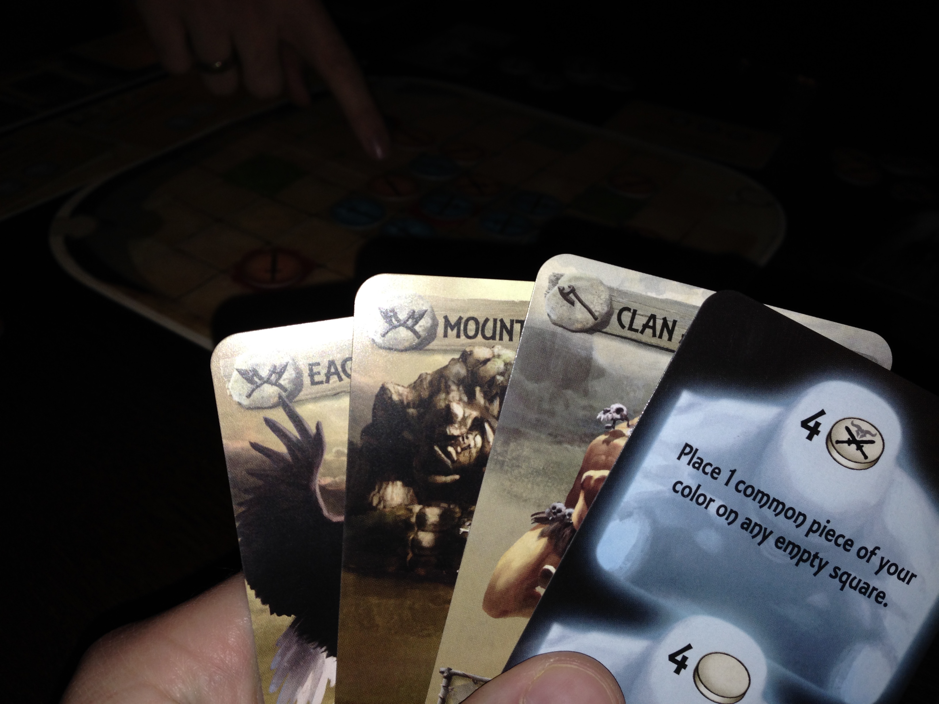 Tash-Kalar. Dette ble vel det beste nye spillet jeg prøvde under Spill-o-rama. Fra Vlaada Chvatil kommer et taktisk spill med stor variasjon. Det ble lagspill – altså 2 vs 2 i turneringen. Jeg hadde prøvd det før 1 vs 1, men lagspill fungerte veldig godt. Det var ikke lov å kommunisere taktikker eller tilsvarende med sin medspiller, så man møtte prøve å lese seg frem. I dette spillet har du et brett bestående av et rutenett, og der har man soldater i nivå 1 eller 2. 2 er sterkere. På hånden har du 3 kort, og kortene har forskjellige mønstre som må oppfylles for å kunne bruke. Om du bruker det, kan du mane frem nye skapninger og få en bonus de drar med seg. De kan virkelig være sterke om de blir brukt riktig. Men en ting jeg likte veldig godt var innhentingsmekanismen. Om motspilleren har X antall flere figurer av X styrke enn deg, kan du få ekstrahandlinger gratis en runde. Så du må tenke deg om før du går for langt forbi motspilleren. Et meget taktisk og flott balansert spill med mange interessante valg. Og kjapt og enkelt å lære, var det også. Må anskaffes.