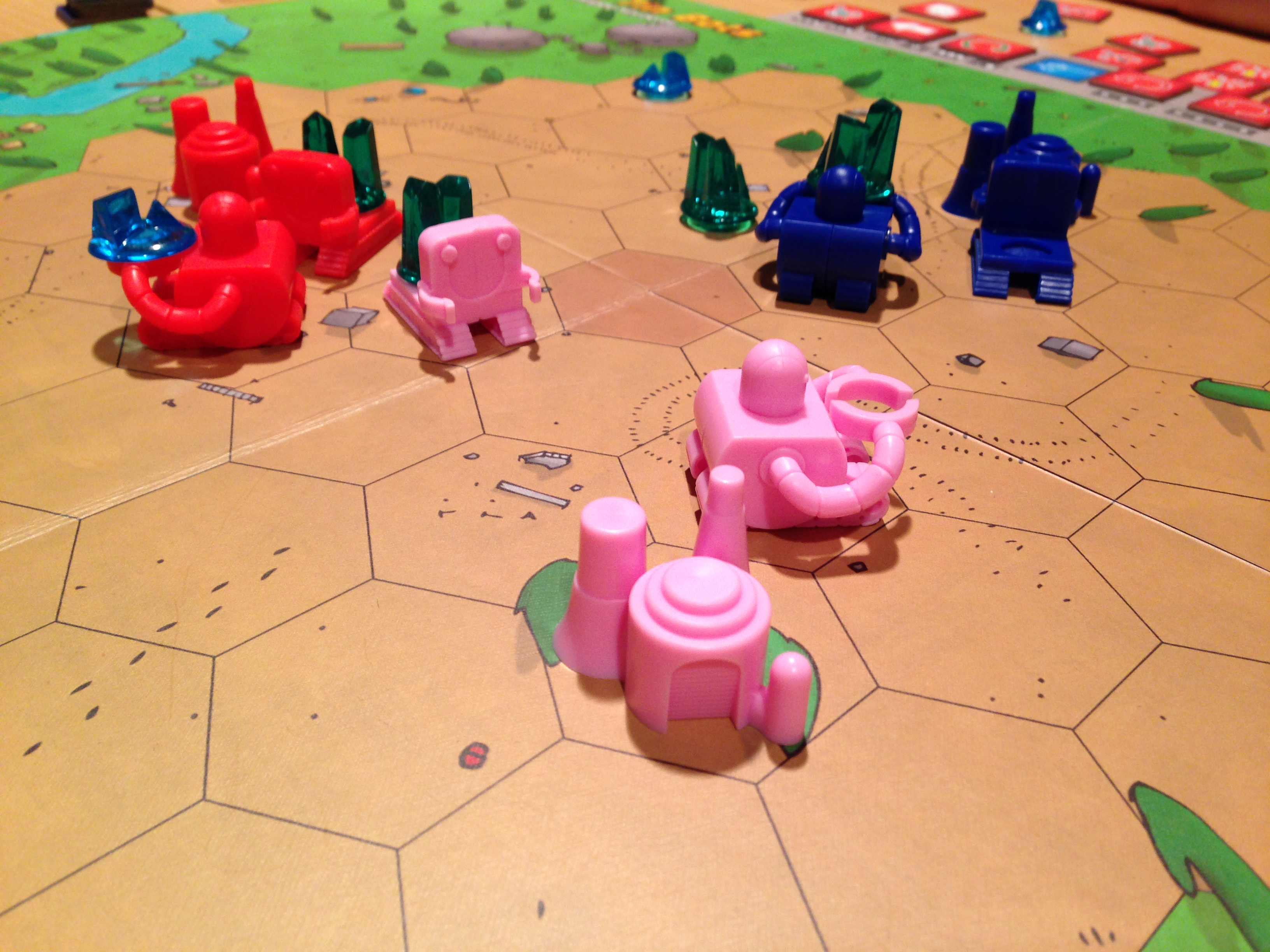 Twin Tin Bots. Dette hadde jeg kikket litt på allerede på Kickstarter (surprise!) men lot vær å gå inn for det. I RoboRally så har du en robot du må programmere møysomt. Det tar tid å tenke og tid å utføre. I Twin Tin Bots har du hele TO roboter å styre. Men likevel går det fortere. Hver robot har 3 kommandoer. På din tur kan du kun gjøre én endring på én av robotene. Og når det er gjort, så utfører begge robotene alle handlingene selv om du ikke ser deg ferdig. Du har mindre kontroll og bare én endring å gjøre på din tur, så det går kjapt unna. Poenget med spillet er å få roboter til å navigere seg rundt på et brett, plukke opp krystaller og levere dem til eget hjem. Jeg likte det, men vet ikke om det har veldig stor gjenspillbarhet.