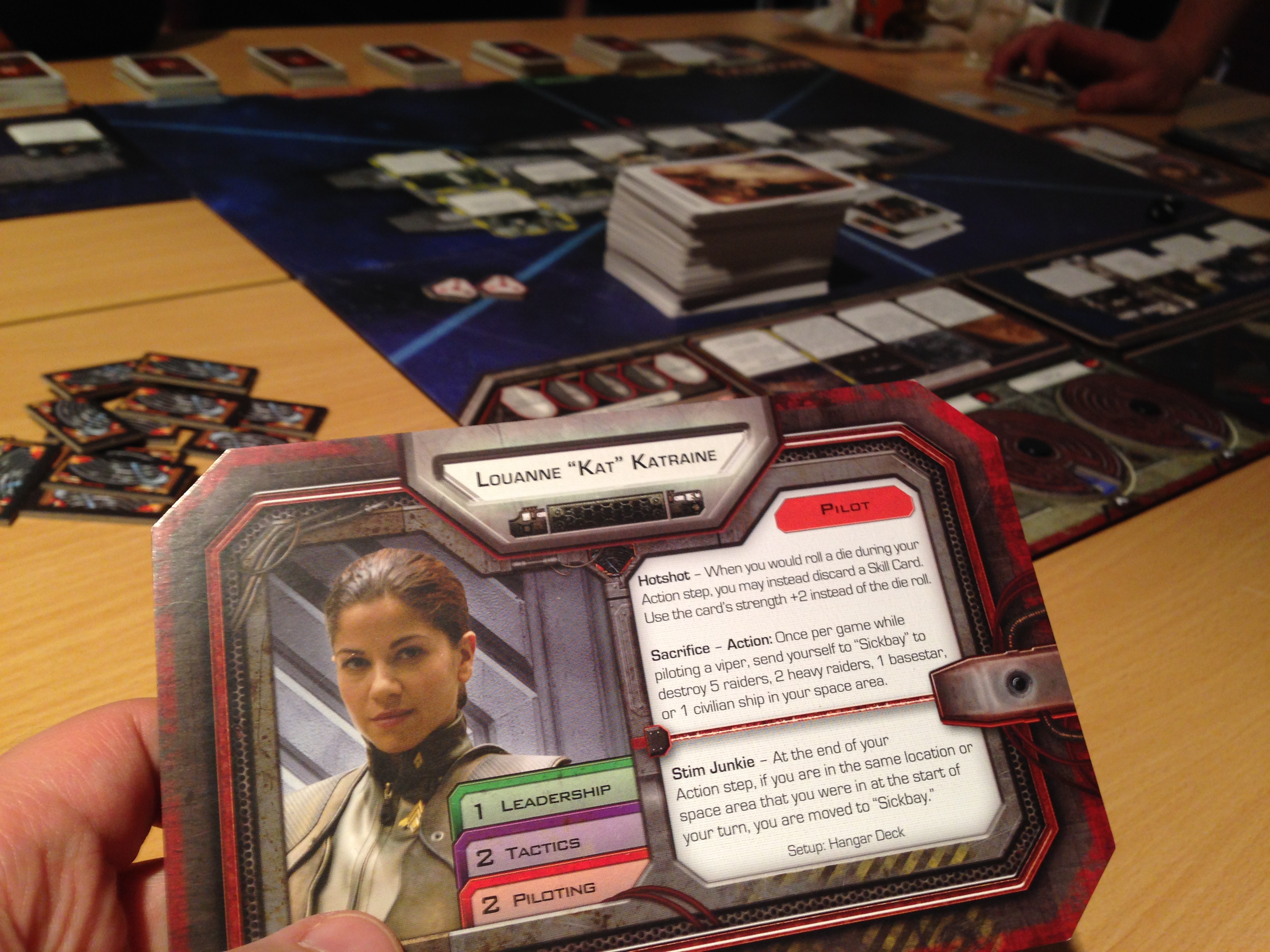 Battlestar Galactica. Aaah, gode BSG. Det har kommet (nok) en utvidelse siden jeg sist spilte det. Vi spilte ikke med hele utvidelsen, bare deler av den. Mine malte figurer fikk pryde brettet, dog det er ganske lite de gjør ut av seg siden de er så små. Vi spilte uten Exodus-utvidelsen som legger til Basestar-brettet (eller er det Pegasus?). I begynnelsen gikk ting veldig galt veldig fort. Alle var så sikre på at presidenten var en Cylon, med meget opplagte trekk mot menneskenes plan. Uansett så ble det veldig lite action på hovedbrettet mtp Cylon invasions. Vi spilte stort sett bare kort som Ruben hadde gode planer for å ta uansett. Men plutselig ble det hektisk samtidig med at alle ressurser var på bunn, unntatt befolkningen – som derimot hadde veldig lav moral. Erik avslørte seg som Cylon da det ble mest kritisk med en slem handling, men vi klarte å få ham i Brig før han faktisk klarte å gjøre sin avslørings-handling. Derfra gikk det fort nedover og vi gikk tom for drivstoff bare 1 poeng over halvveis i spillet. Det viste seg at det kun var 1 cylon i spill, etter jeg hadde stokket bunken feil, tydeligvis. Likevel så tapte vi. Gøy spill, men jeg skal forberede Basestar-brettet til neste gang, det skaper bedre action i spillet. Dette er et spill som virkelig fanger tv-serien godt. Det er fullt av intriger, anklager, usikkerhet og den stadige mangel på ressurser og kampen mot Cylons. Dette er et ordentlig opplevelsesspill, så ikke forvent mye taktikk og strategi her.