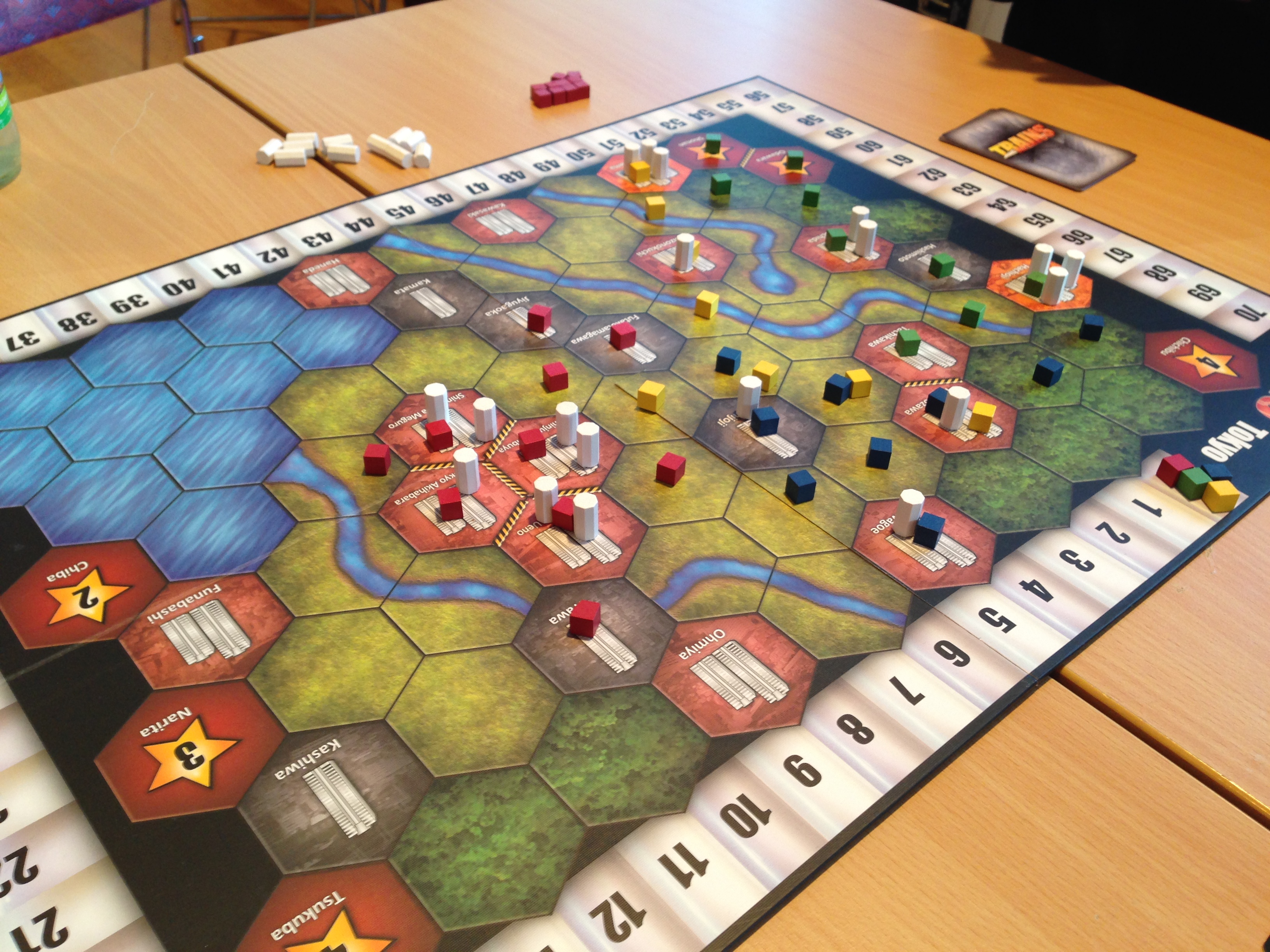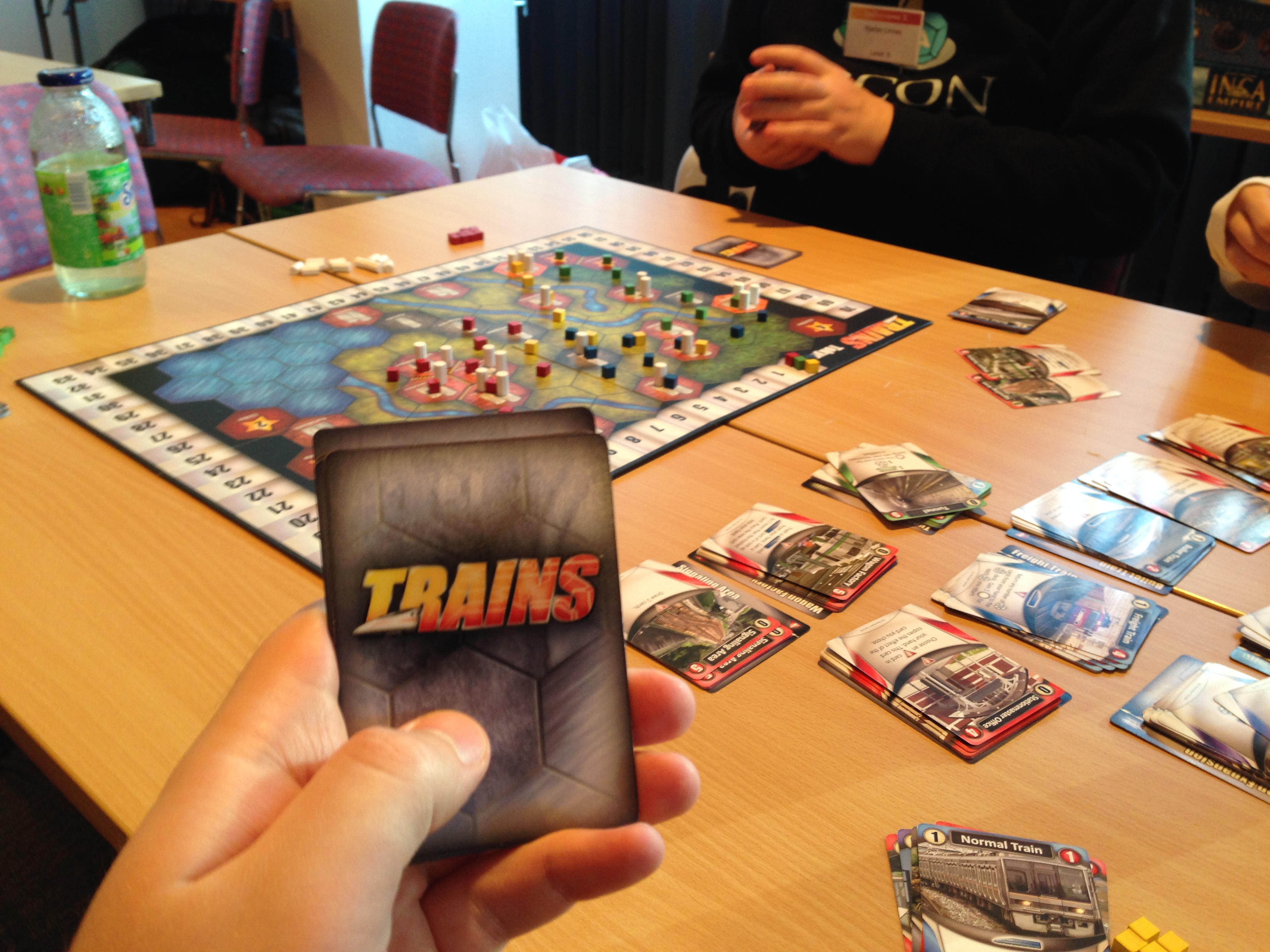 Trains. Spillet med det ærligste navnet, omtrent. Og kanskje kjedeligste. Tog. Dette er Dominion med brett, kort sagt. Men det føles bedre, for her – når du ekspanderer – så ekspanderer du faktisk. Du ser at nettverket bygger seg ut. Det handler om å bli først, men man kan få like mange poeng med å komme siste – det koster bare flere penger å kjøpe seg inn. Penger er ikke verd noe i slutten, men man trenger nok på hånd til riktig tid for å komme seg inn. Hvis du bygger for mye eller bygger deg inn i konkurrentens territorium, så får du ekstra Waste-kort på hånd. De tar kun plass og minner deg på at forsøpling er dårlig. Du må ha kort som håndterer disse. Kort fortalt så syns jeg Trains var et kjekt spill, men har behov for utvidelse før det blir interessant nok til å kjøpe inn for min del. Uansett så foretrekker jeg Trains over vanilla Dominion any day.