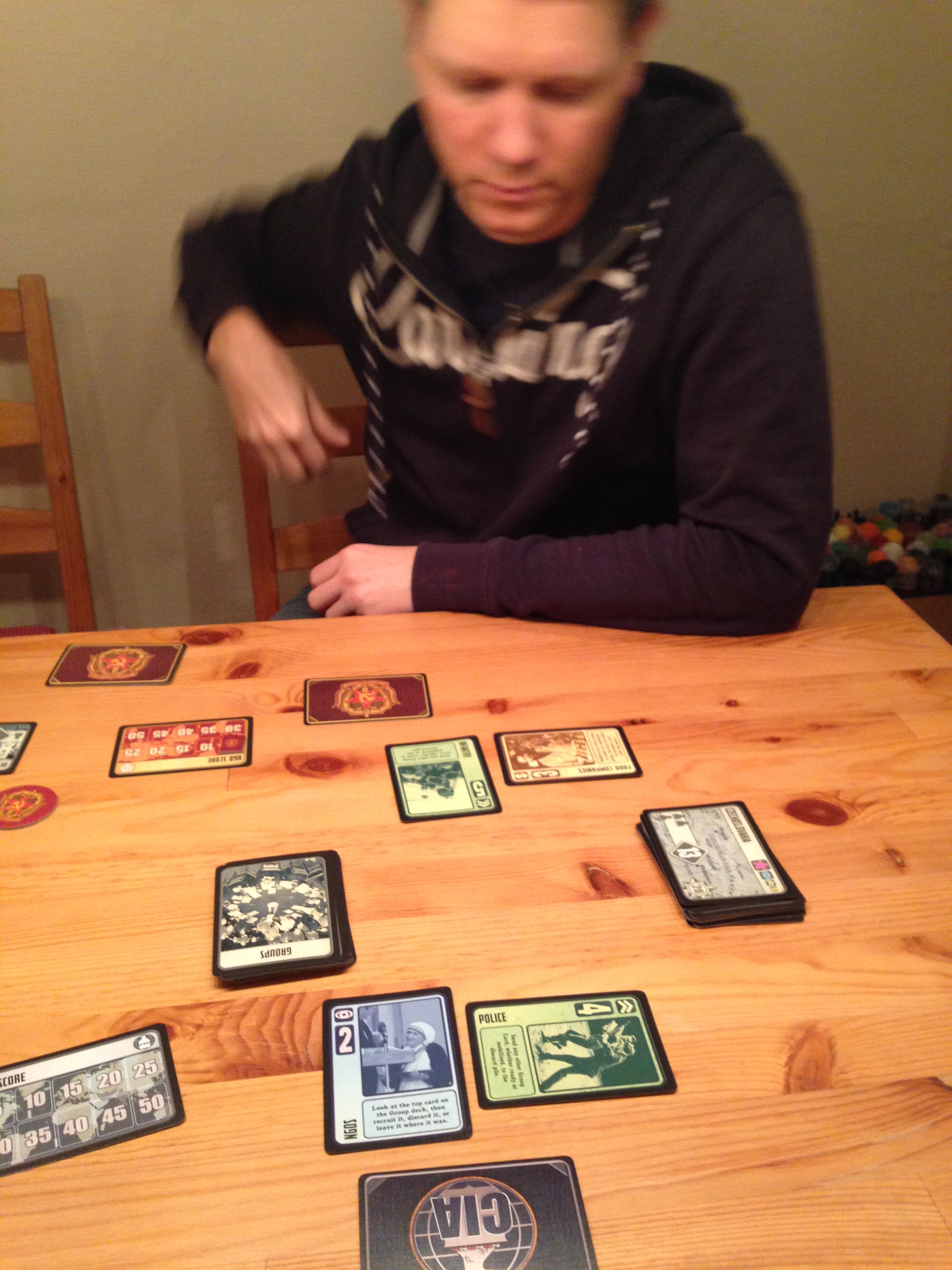 Kveldens siste (og minste) spill ble Cold War: CIA vs KGB og hadde en meget uskyldig størrelse for en liten avslutter. Esken passer nesten i lommen hadde det ikke vært for tykkelsen, og reglene er tynne. Vi spiller hver vår fraksjon, CIA eller KGB, med hver våre agenter. Agentene har identiske funksjoner, men representerer altså hver sin nasjon. En runde går slik: Oppdraget avsløres. Velg en agent skjult og legg den klar. Oppdraget har følgende informasjon: hvor mange kort som kan trekkes og hvilken maks-verdi det har. I tillegg kommer tie-breaker-informasjon. Trekk ett kort fra gruppe-bunken. Dette kortet har en verdi som skal matche oppdragsverdien så nært som mulig uten å gå over. Går man over, så dør agenten. Det er veldig ille. Annenhver gang flipper vi opp kort eller passer, og den som er nærmest oppdraget vinner. Men så kommer agentene til syne: disse kan gi fordeler hvis du har vunnet oppdraget, eller du vil kanskje at motstanderen skal vinne, for hvis du spilte agenten riktig så vinner du likevel! Skillz prøvde på dette flere ganger, men det feilet stort sett.