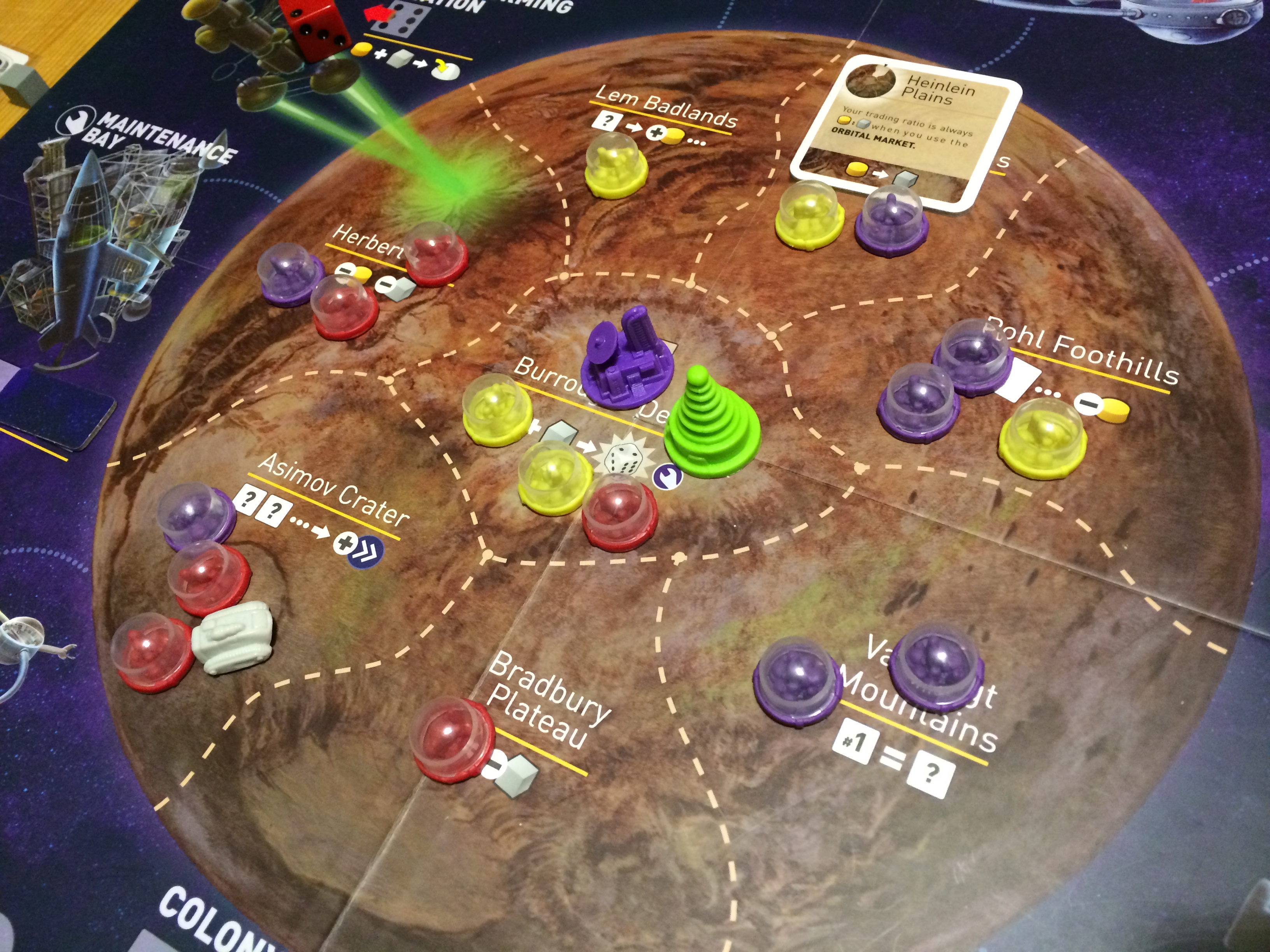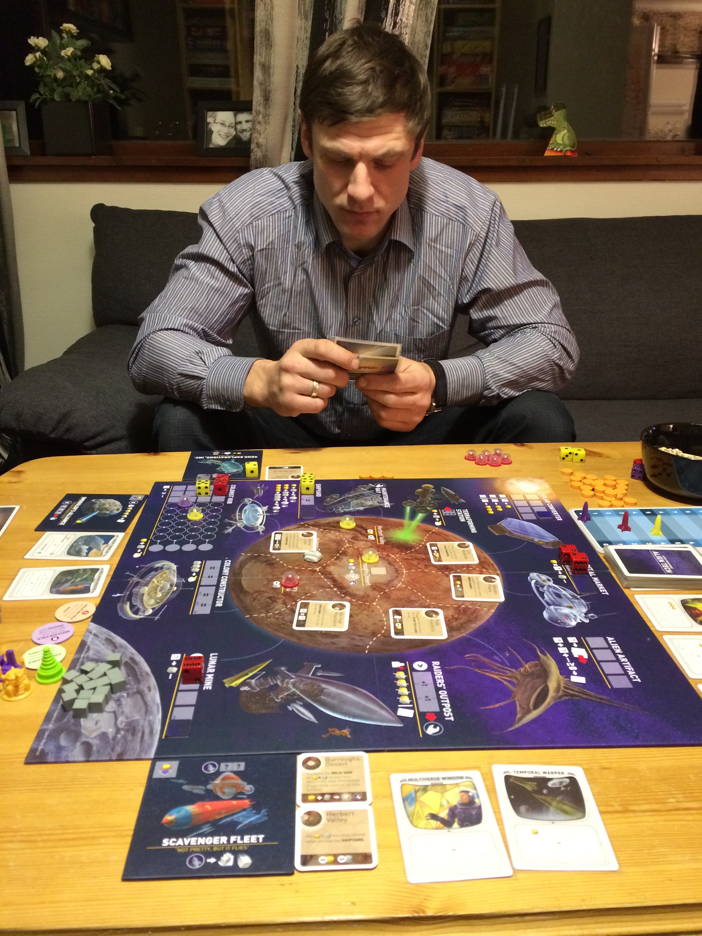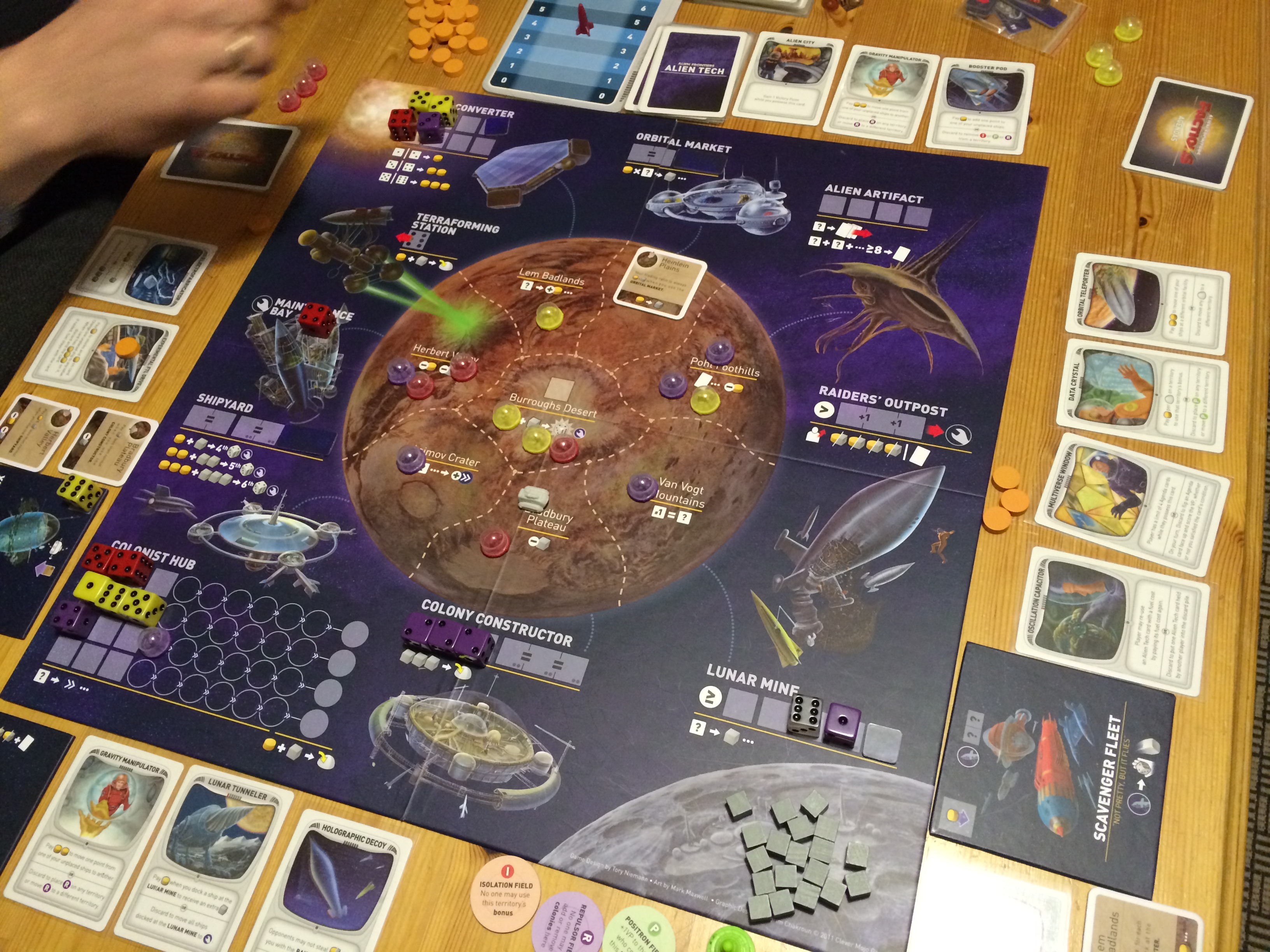 På menyen stod det flere titler, noen kjente og andre ukjente. Myrmes fristet godt, men Takras hadde kun spilt dette ved å få lært til seg reglene, så vi sjanset ikke på å prøve dette uten solid regelforståelse. Valget falt ellers veldig lett på Alien Frontiers, et spill alle var kjent med, dog Saulius trengte et lite minne-kick for å huske at han hadde spilt det fra før under en klappekonsert. Så det ble en fullstendig regelforklaring likevel, men det ble veldig få spørsmål.