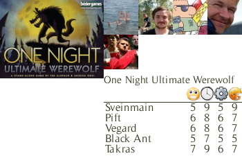 De som har spilt Werewolf eller Mafia vet hva det dreier seg om. Finn varulvene! One Night Ultimate Werewolf tilbyr dette, men på 10% av tiden til de andre og samtidig gi den samme følelsen. Denne gangen foregår alt på én natt, men det er flere roller i spillet som gir informasjon om hvem som er hvem. Spillet er veldig enkelt, men det krever et par gjennomspillinger før man skjønner helt hva rollene gjør og hvordan de bør brukes. Men spillet er så kjapt og underholdende nok til at «én gang til»-faktoren er høy. Vi tok 4 runder på veldig kort tid, og det er mye latter og mange falske anklager rundt bordet. Spesielt når Sveinmain gjør seg selv veldig mistenkelig som varulv at han får 4 av 5 stemmer, og ingen var blitt varulv!