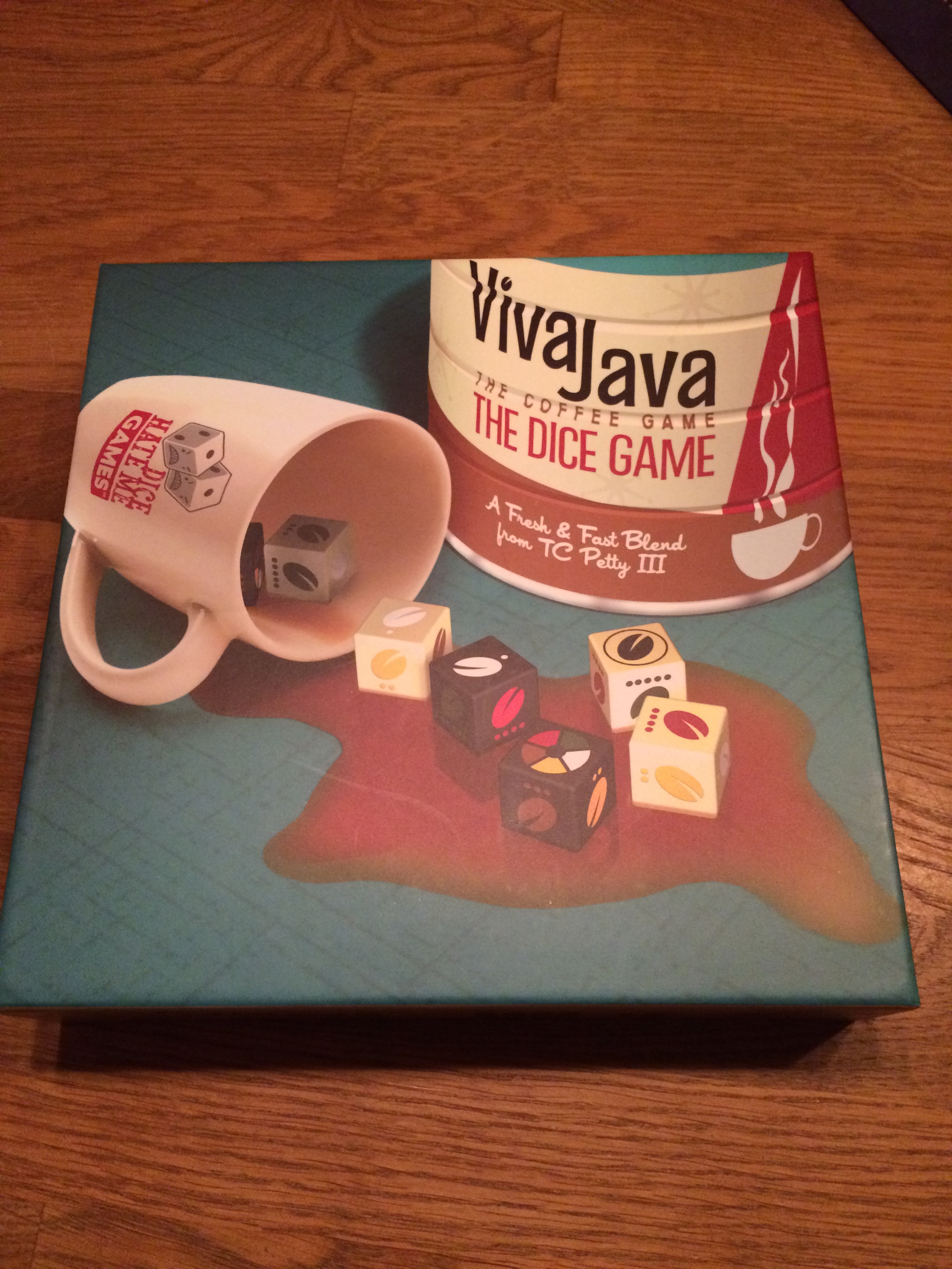 Men så ble vi plutselig 3 spillere. Kate Potet hadde veldig lyst å spille i kveld og turte ta turen innom, og det ga mersmak på en ellers rolig tomannskveld. VivaJava: The Coffee Game: The Dice Game var allerede satt opp, så det var bare å hoppe rett på reglene. Dette er et enkelt terningspill som gir en god del valgmuligheter underveis. Du kan gamble på å brygge kaffe og score poeng, eller du kan forske på forskjellige ting til å hjelpe deg med å lage enda bedre kaffe. Men når du velger poeng, så får du ikke forsket, mens alle andre spillere får seg nye fordeler. Spillet går til 21 poeng og så er det over. Et artig spill vi tok to runder av, og det har utrolig mange variasjonsmuligheter.