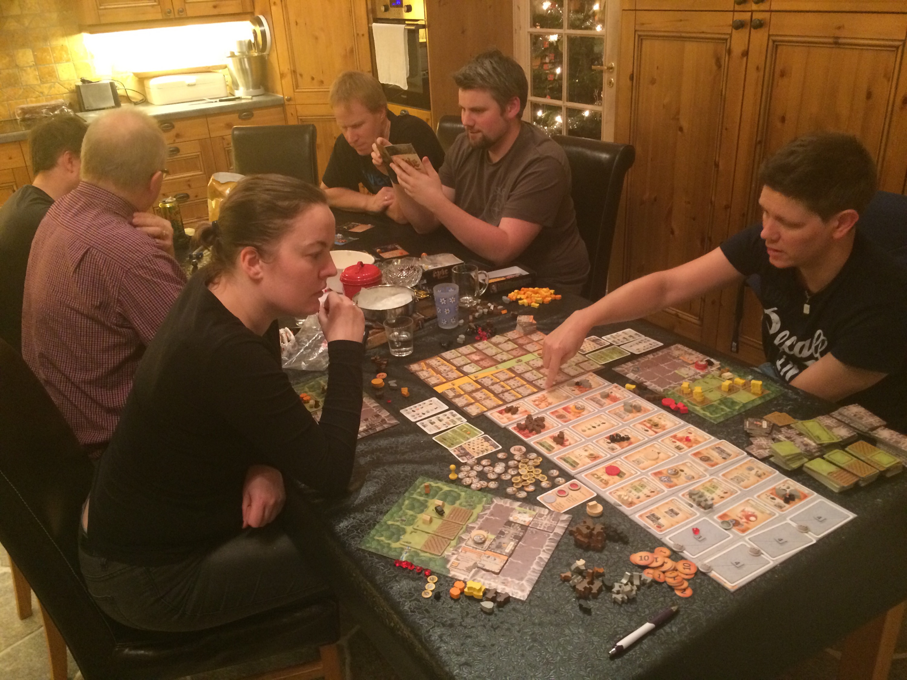 Etter en fellesmiddag fortsatte festen med noen andre spill. Stone Age fant veien tilbake til PG. Med fire spillere ble det en hard kamp om plassene og matproduksjonen ble utfordret. Hollender sikret seg mye mat i starten og kunne da fokusere på andre saker. Siri kastet de første rundene sjeldent over 2 (!) og kom på etterskudd. Skilz bygget ivrig, men Takras og