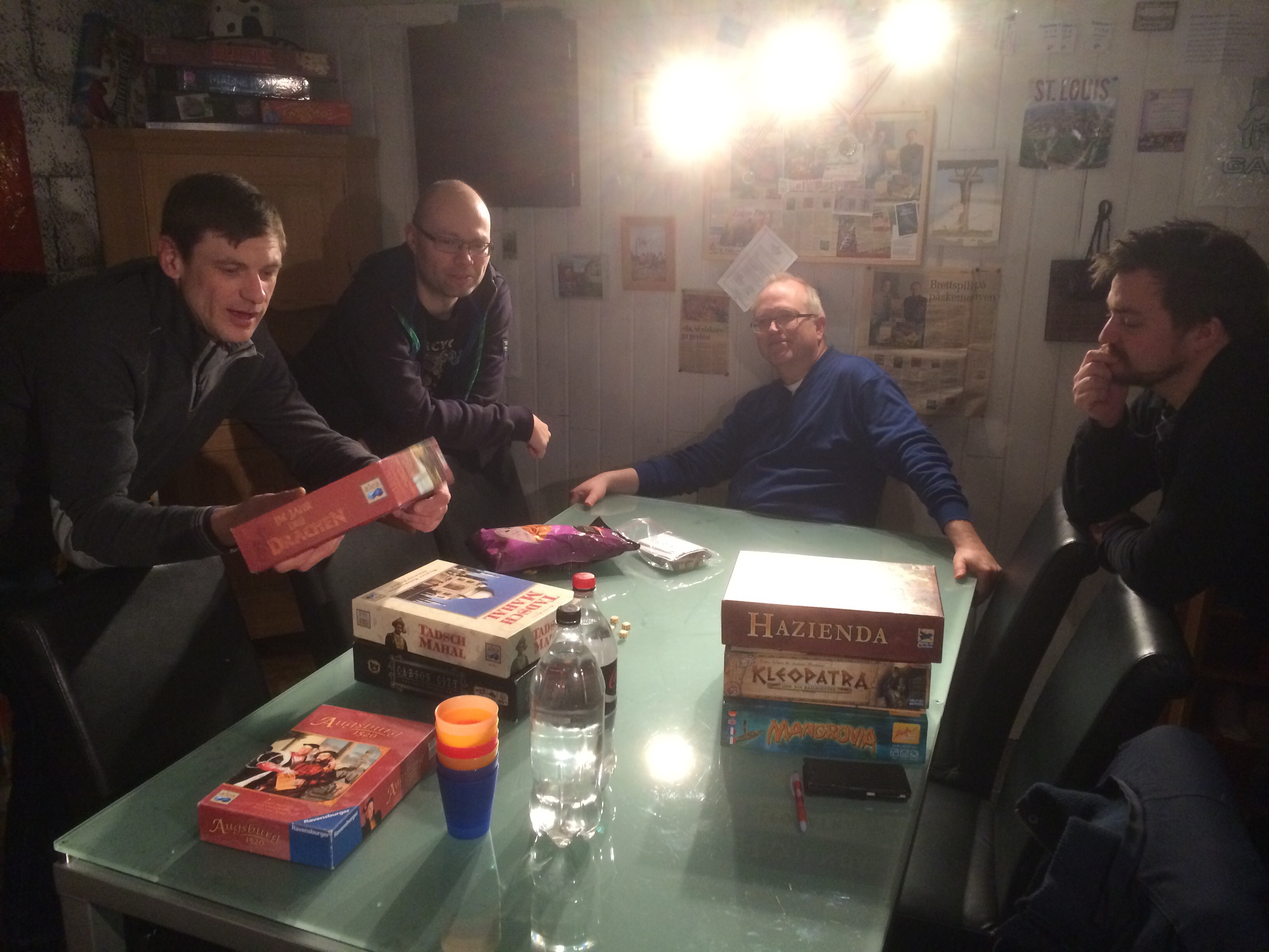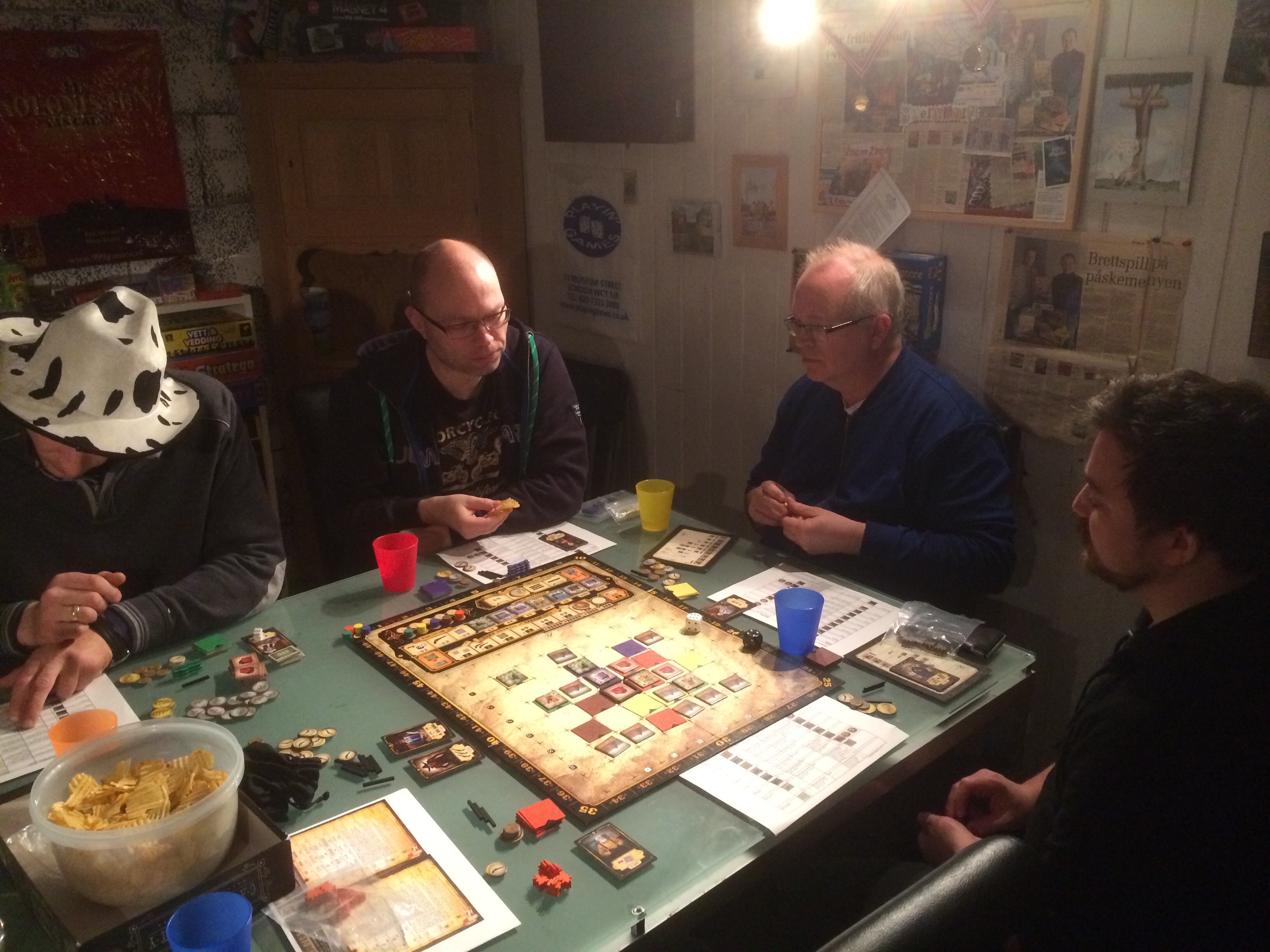 Sveinmains abstinenser hadde nådd nye høyder etter 14 dager uten spilling. Og med plussgrader ute var det på tide med en sesongåpning i Grotten. Hele 5 spillere hadde meldt sin ankomst, men med 5 spillere synker antallet aktuelle spill dramatisk da en ikke kan dele seg i 2 og 3! Men heldigvis har Grotten et stort utvalg av 5-mannsspill. Hvilket skulle en velge. Vi tok den vanlige PG-metoden for valg av spill. Av 22 aktuelle spill valgte alle bort 3 spill hver som en definitivt ikke ville spille. Vi sto igjen med 7 spill, og kastet terning om hvem som skulle velge til slutt. Alle valgte bort et spill hver og Saulius fikk æren av å velge mellom Augsburg 1520 og Carson city som var de 2 siste kandidatene. Og valget falt på det siste.