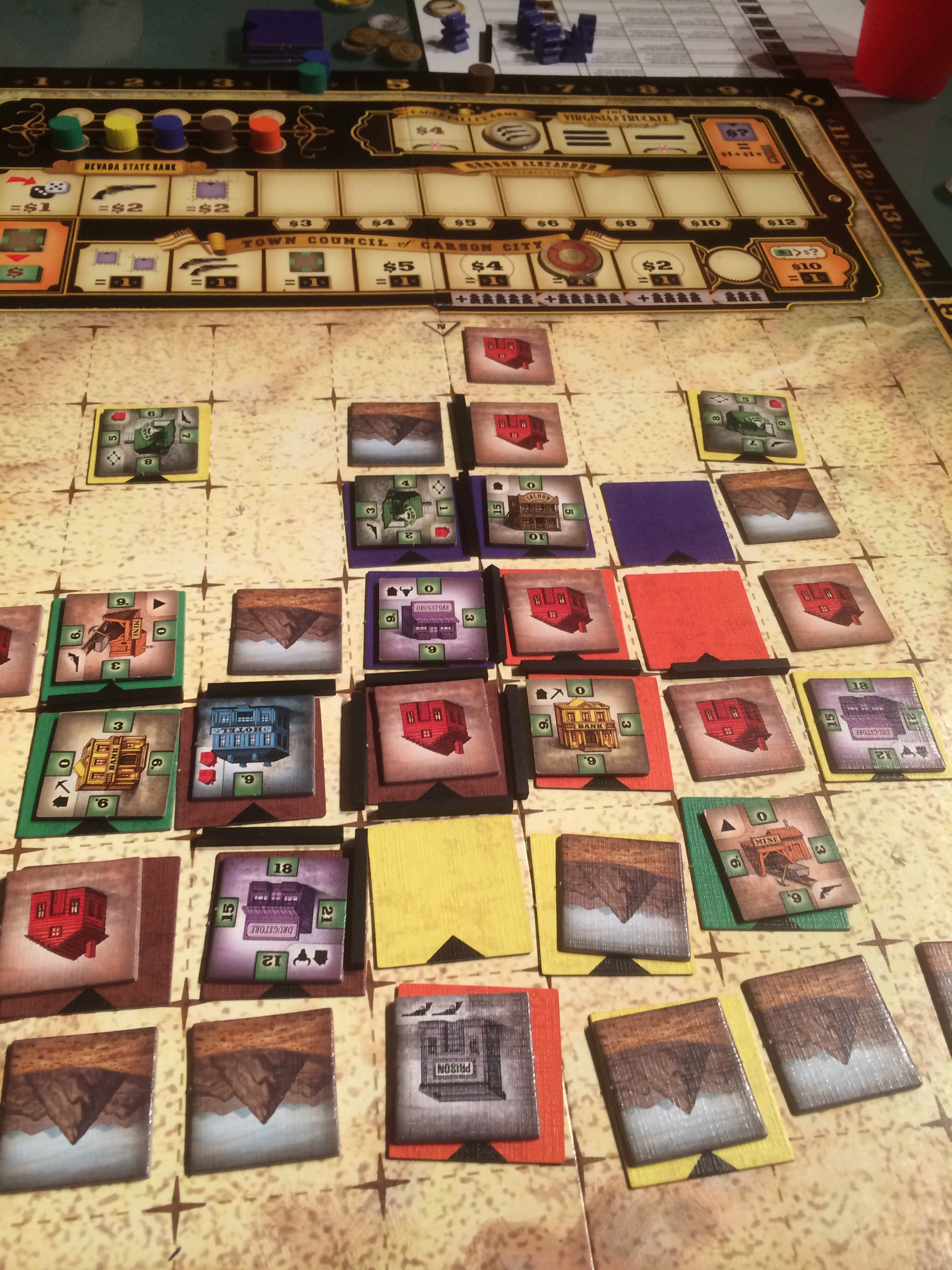 I Carson City er vi alle cowboyer som skal bygge rancher, salooner og drugstores i Carson city. Men en må også ha veier til husene sine, sanke penger og ikke minst seierspoeng underveis. Før en kommer i gang er det rolleutvelgelse fra Sheriff til Outlaw. En må også prøve å skaffe seg gruver og rancher og kanskje et fengsel eller 2 for det gir pistoler som gjør det mulig å vinne dueller, noe som er viktig å byen. For i motsetning til Agricola som spillet kan ligne litt på, så kan en her utfordre motspillerne på fordelsfeltet der de står til duell. Den avgjøres av antall pistoler en har, pluss et terningkast, med dertil stemning! Og god stemning ble det.