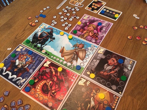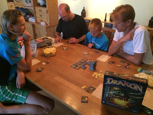 sekken. Her skal man legge ut en ny brikke (et rom) eller flytte sin egen helt et felt. Den første runden ble antiklimaks, for det ble mer en slags gullrace hvor Takras var mest heldig. For å unngå spilleslakt spilte vi en runde til. Denne gangen ble det plassert flere rom og ble det betraktelig mer sabotasje. Til slutt vant Oscar som klarte å samle 10 poeng som første mann. Godt å spille Drakon to ganger, for det var absolutt et spillbart spill.