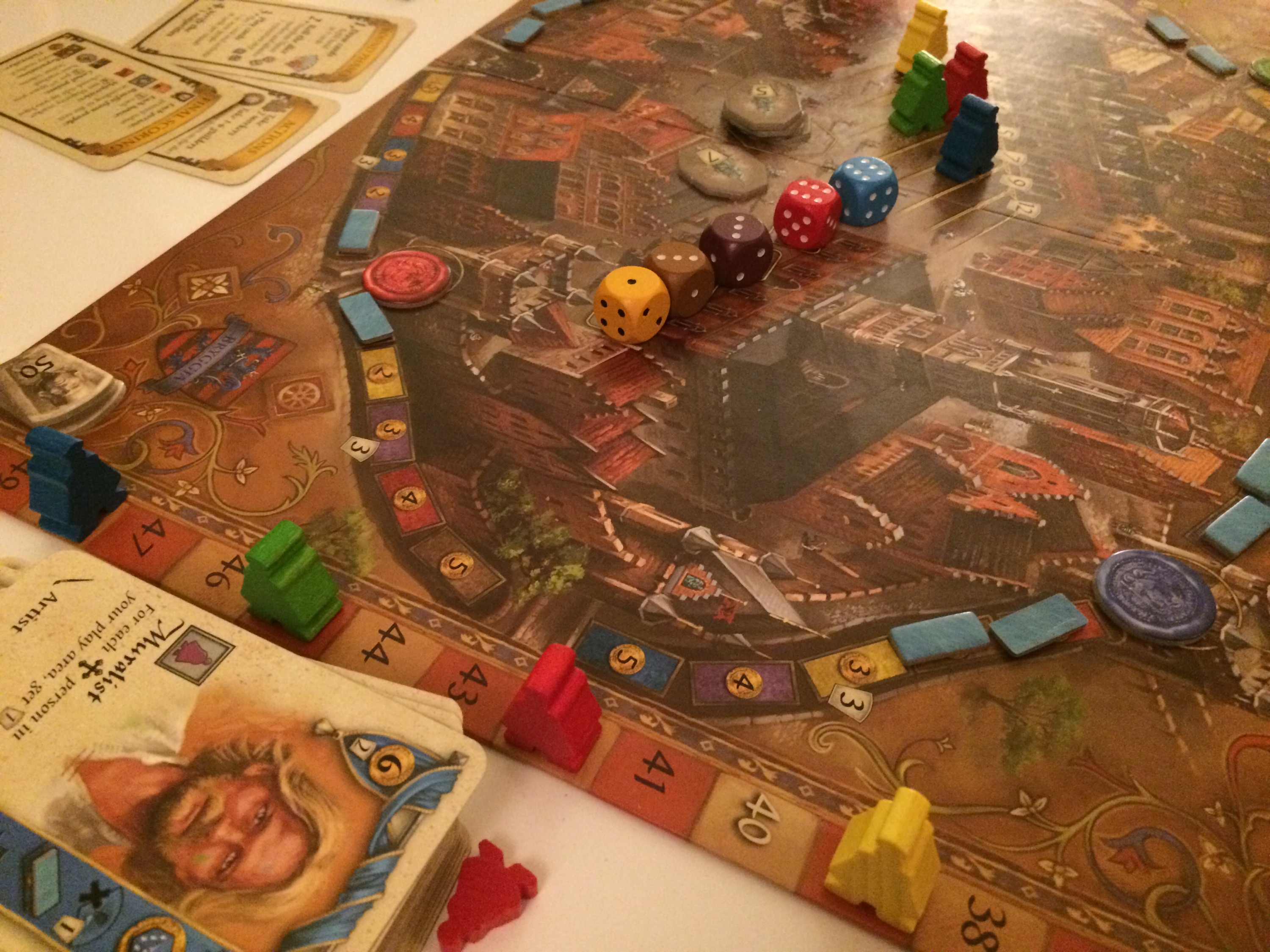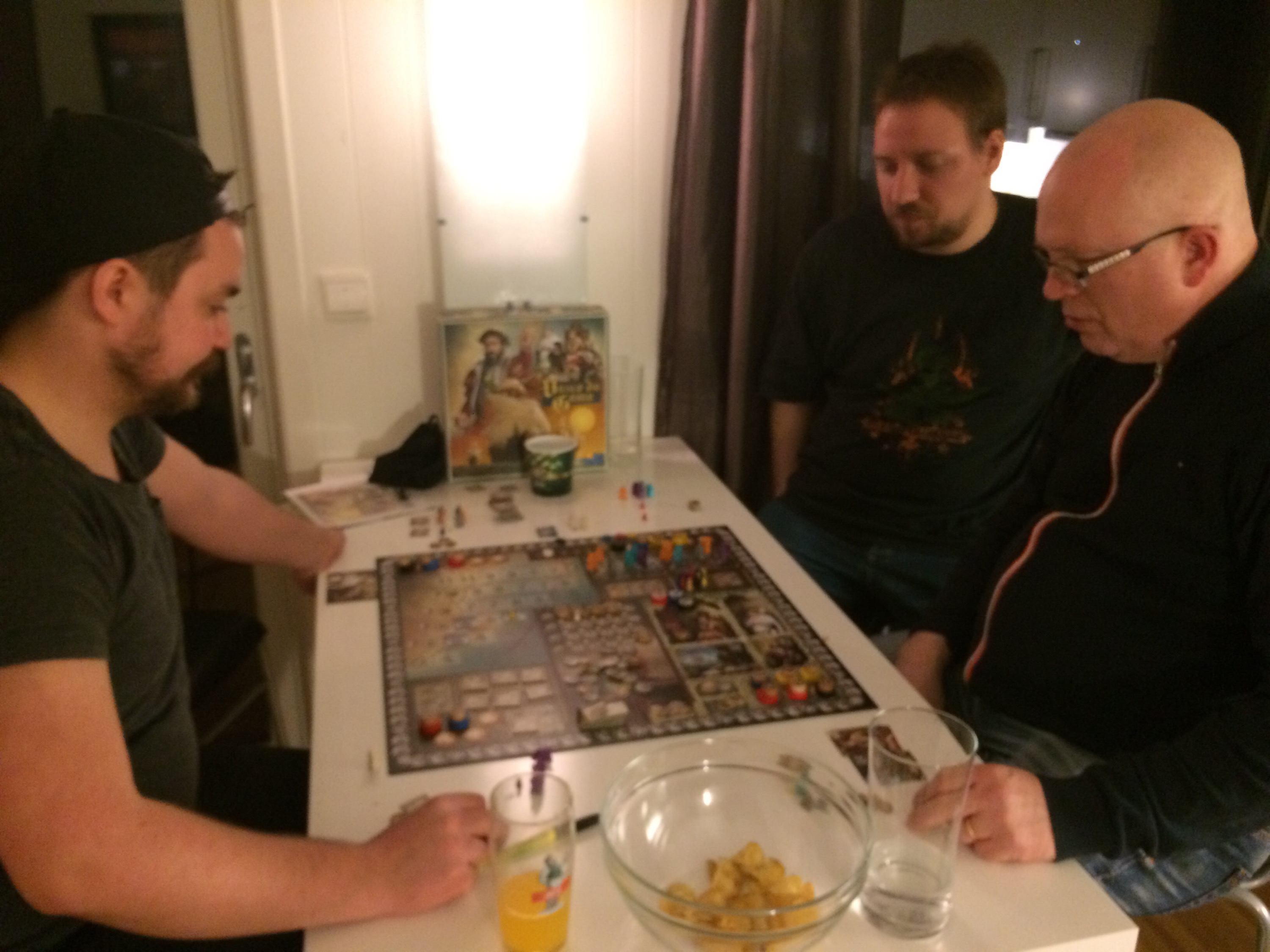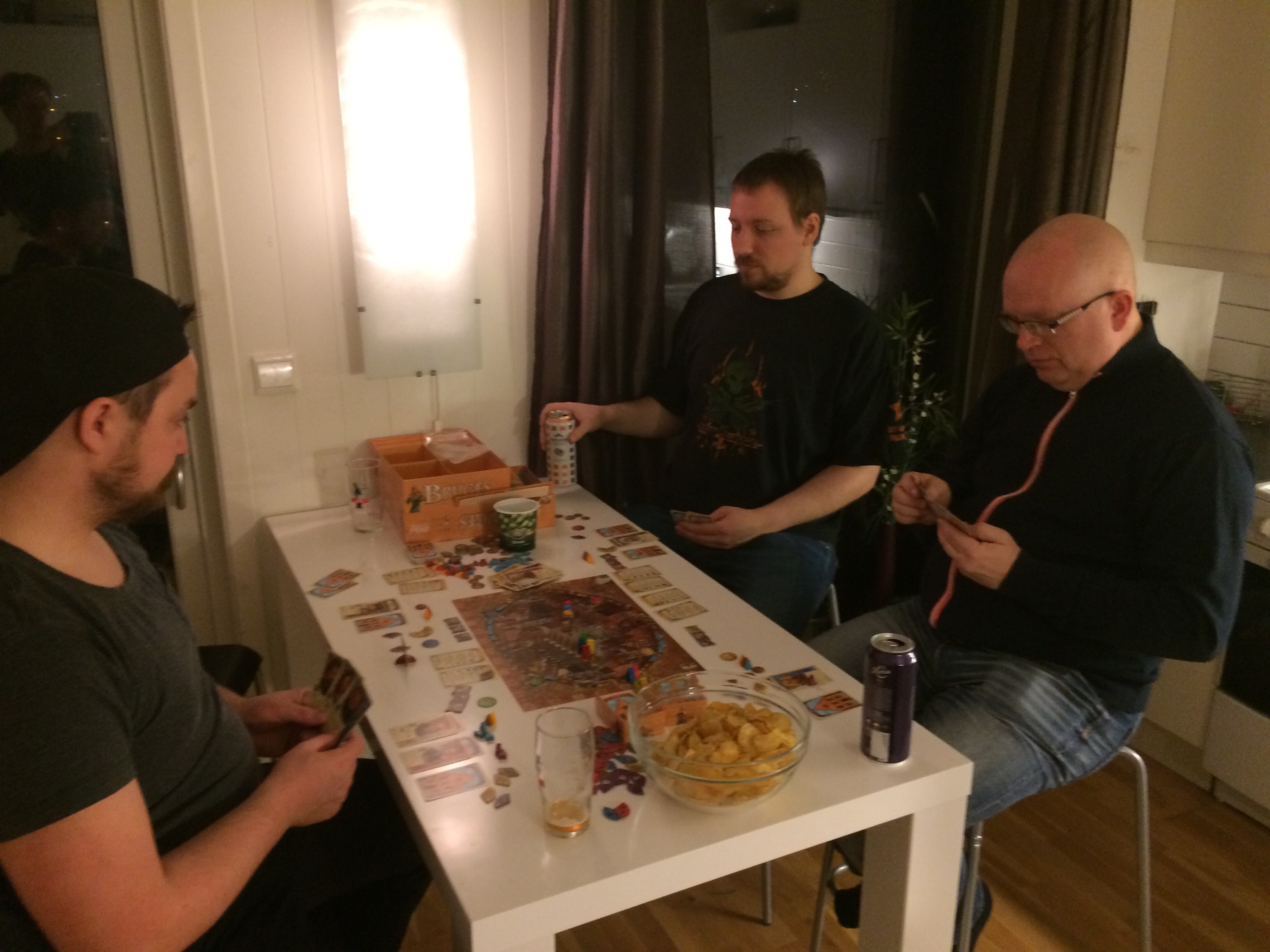 Kveldens første spill var Bruges eller Brugge som de sier de i Belgia. For Vegard var det nytt, mens resten hadde det spilt det bare noen dager tidligere. Bruges spilles lett og rundene går fort. Det ble som forventet hard konkurranse om majoritetene. Pift og Vegard bygget hus, mens Peter og Hollender satset på kanaler. Noen ganger kan det være litt frustrerende når man venter på en bestemt farge, men egentlig kan man gjøre masse i spillet som gir poeng. Hollender vant denne gangen.