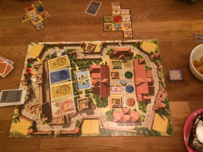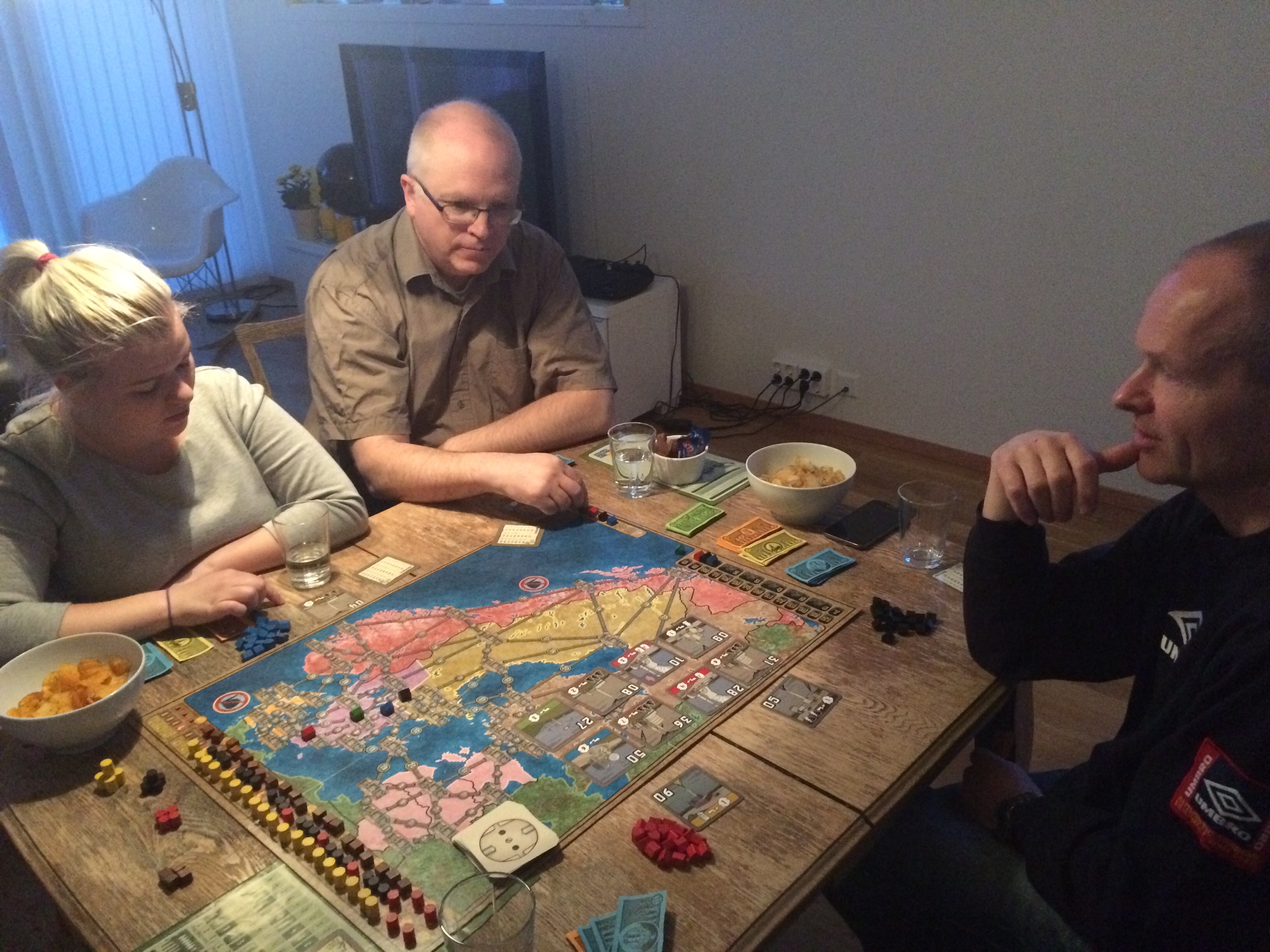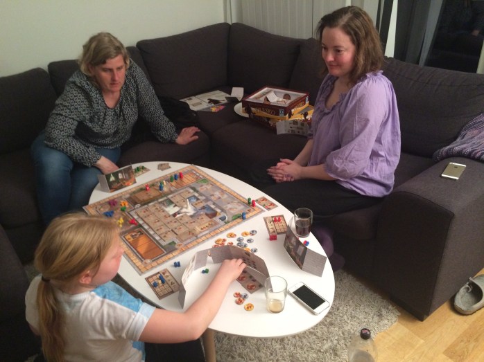På kjøkkenbordet var det 6 spillere som spilte Alhambra. Siri forklarte reglene til Tone og Erika. Ibrahim, Noorullah og Kate hadde spilt det før. I kjent stil (og med litt flaks) kunne Siri kjøpe brikker en passende pris hver runde. Ekstra handlinger pleier å lønne seg i Alhambra og det gjorde det også denne gangen. Siri vant med god marging, men det så ut som om alle koste seg.