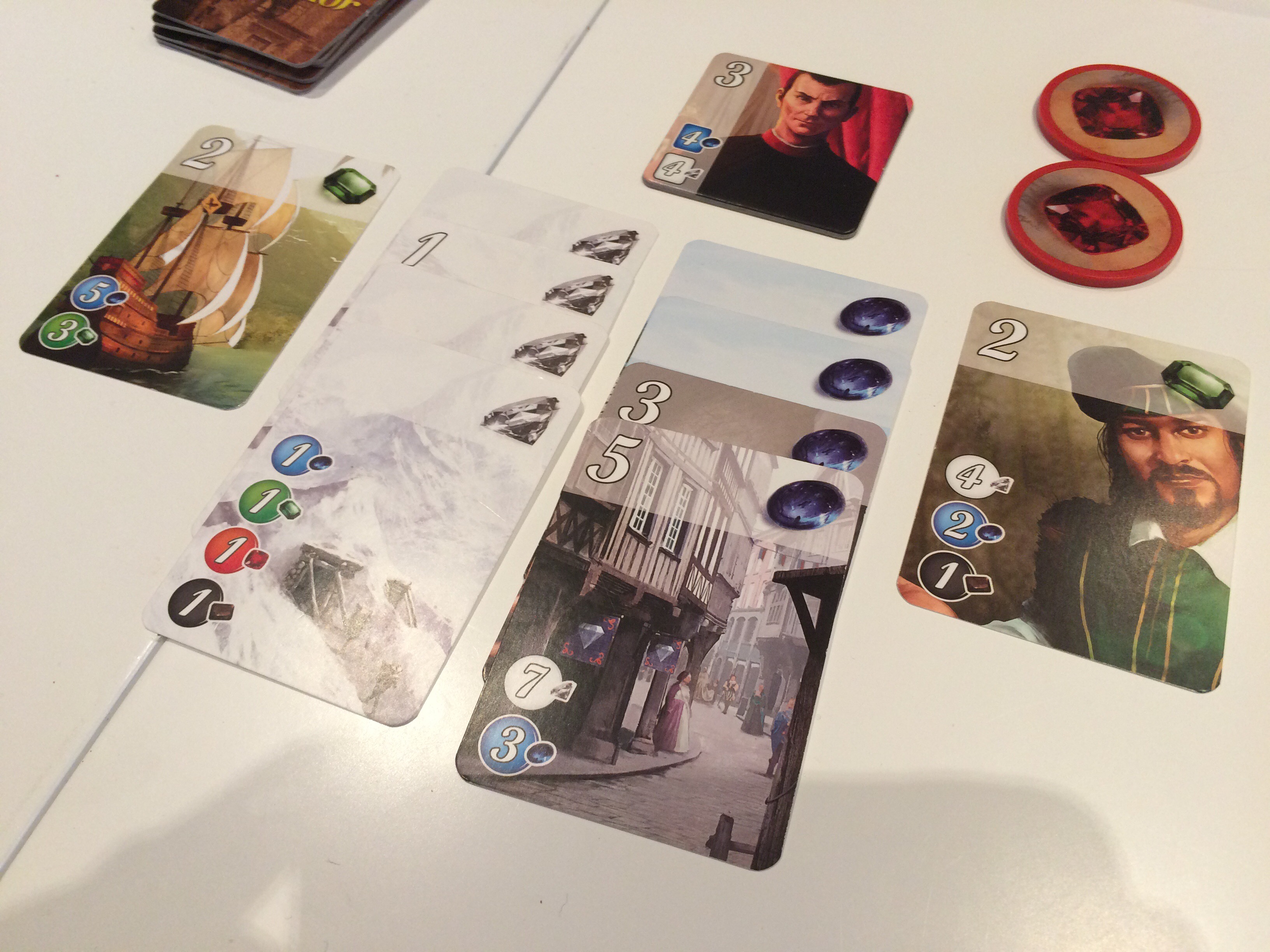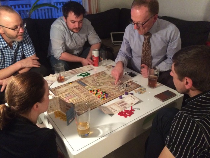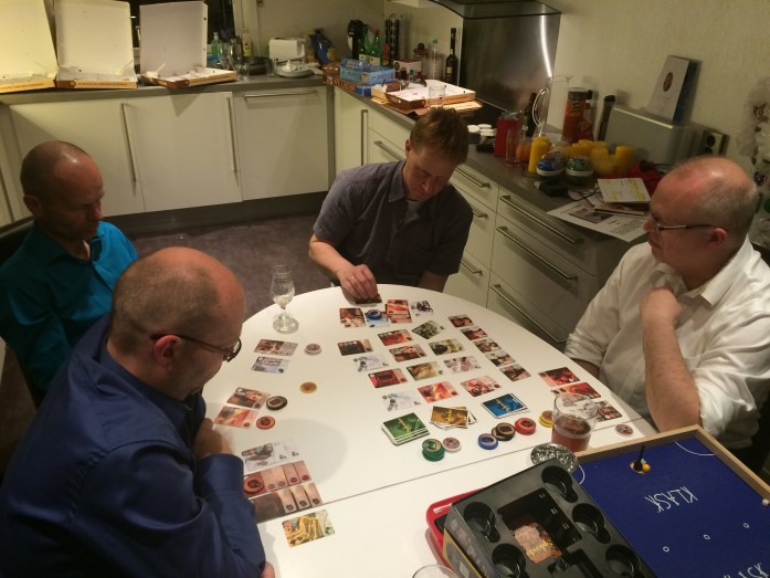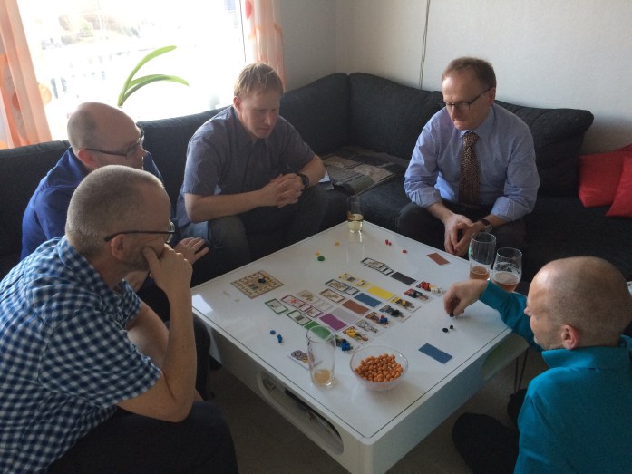 På husets minste bord spilte Robert, Sveinmain og Hollender Discoveries. En enkel variant av spillet Lewis+Clark. Robert strevde de første rundene og gav Sveinmain anledning til samle mange terninger. Terninger brukes til handlinger så det er alltid bedre å ha for mange enn for få. Sveinmain og Hollender hadde et skikkelig kappløp hvor de jobbet hardt for poengene. Til slutt vant Sveinmain med et knepent poeng foran Hollender. Robert vil gjøre sine hjemmelekser (se på bgg-klipp om strategi) og komme sterkt tilbake neste gang.