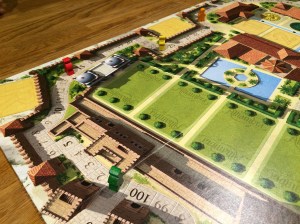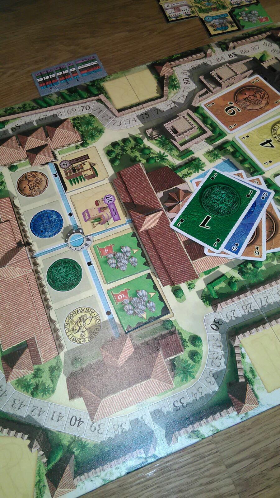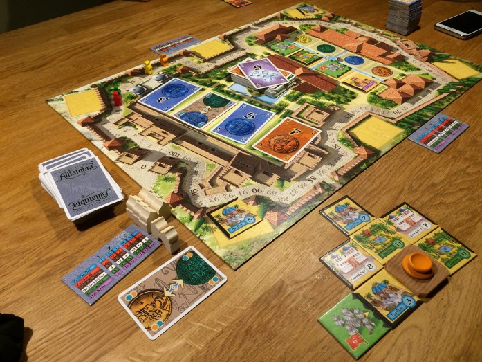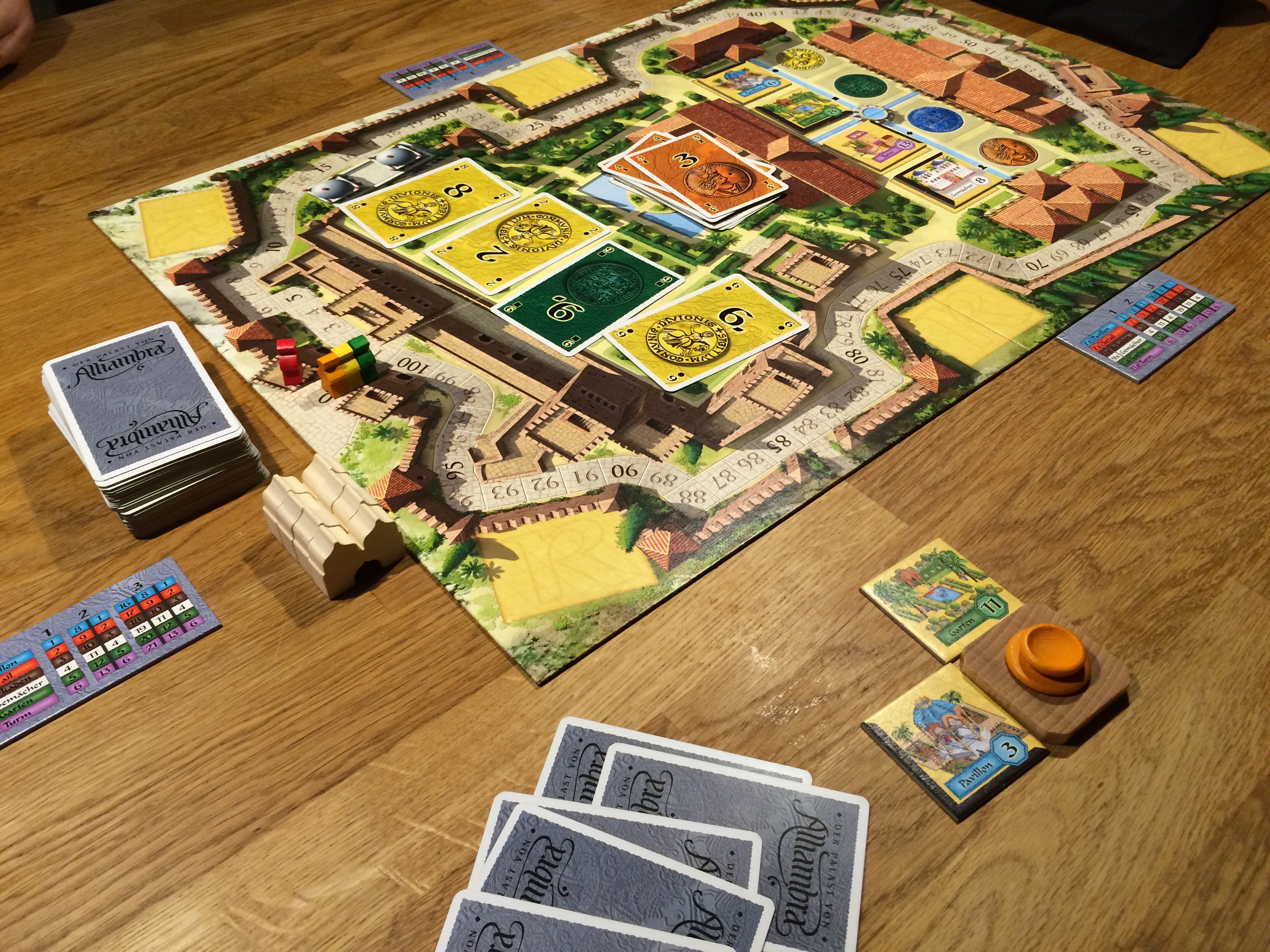 Alhambra har vært et godt likt spill i mange år. Alle hadde spilt det før. Spillet ble frisket opp med den andre utvidelsen. Siri minnet alle om at hun sjeldent taper Alhambra, men Peter mente at han måtte passe mest på Hollender. Sistnevnte startet bra med to bybrikker i både blå og hvit. Peter hadde desidert mest penger på hånd og satset hardt på grønn og lilla majoritet. Siri hadde som vanlig en vakker mur rundt byen sin, men denne gangen slet hun med å få gode poeng for majoritet.