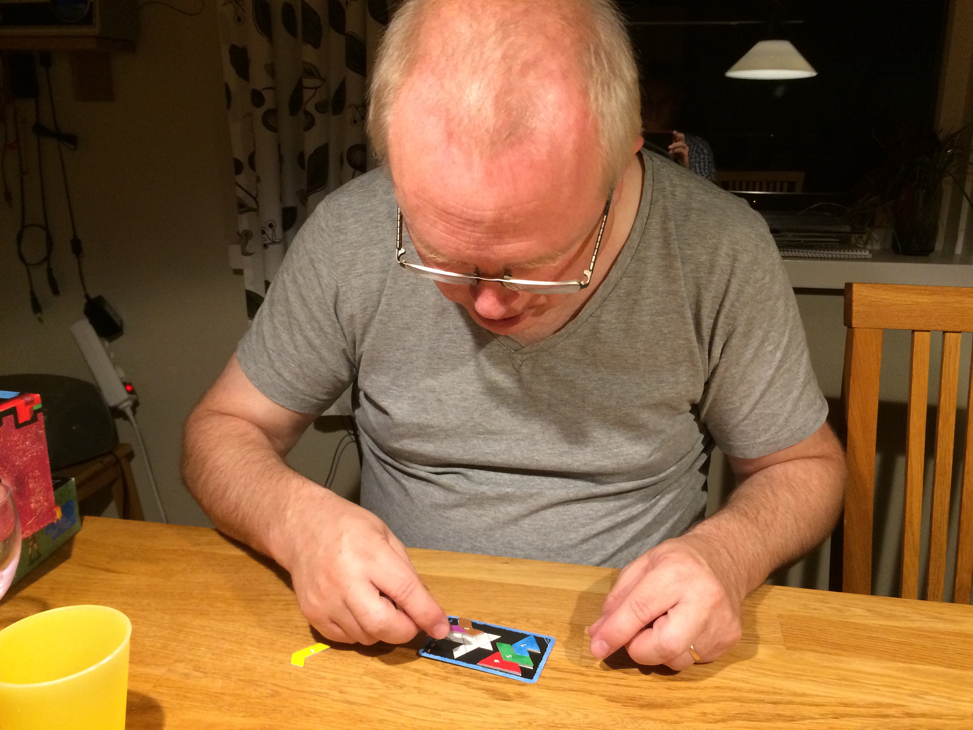 Peter og Hollender fortsatte spillfesten med Ubongo Trigo. I denne varianten skal man løse to puzzleoppgaven med 6 ulike brikker. Vanskelighetsgraden kan sammenlignes med de mest krevende i ubongoklassen. Når en er ferdig, får den andre 20 sekunder til å klare oppgaven. Det ble spilt 8 runder. Hollender tok en rask ledelse med 2-1, men så snudde Peter til 2-3. De siste rundene kunne vare lenge og hodene ble stadig varmere! Hollender snudde igjen til 4-3 med bare 2 runder igjen. Peter måtte vinneneste runde, men Hollender slo spikeren i kisten og vant med 5-3. Ubongo Trigo er en god hjerneknekker i en lettvint reisepakke!