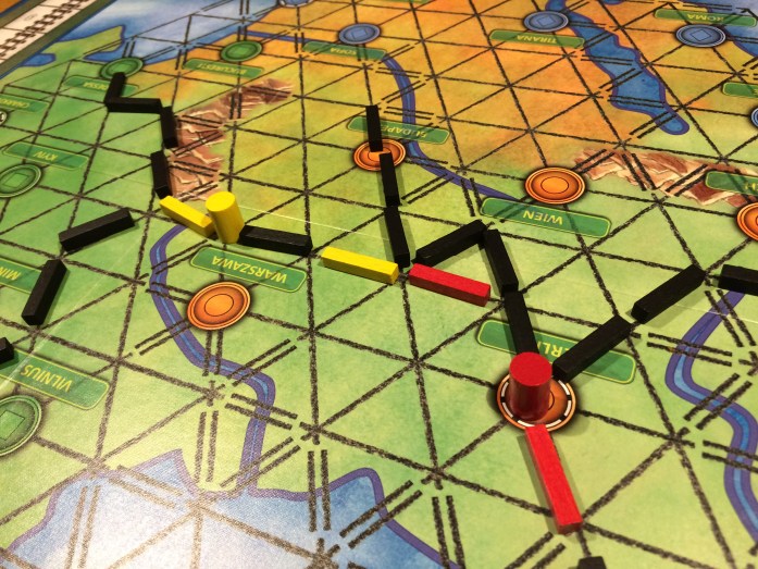 Trans Europa var kveldens avslutter. Vi spilte med alle byer og utvidelsen som gir spilleren tre egne jernbaner som bare han kan bruke.