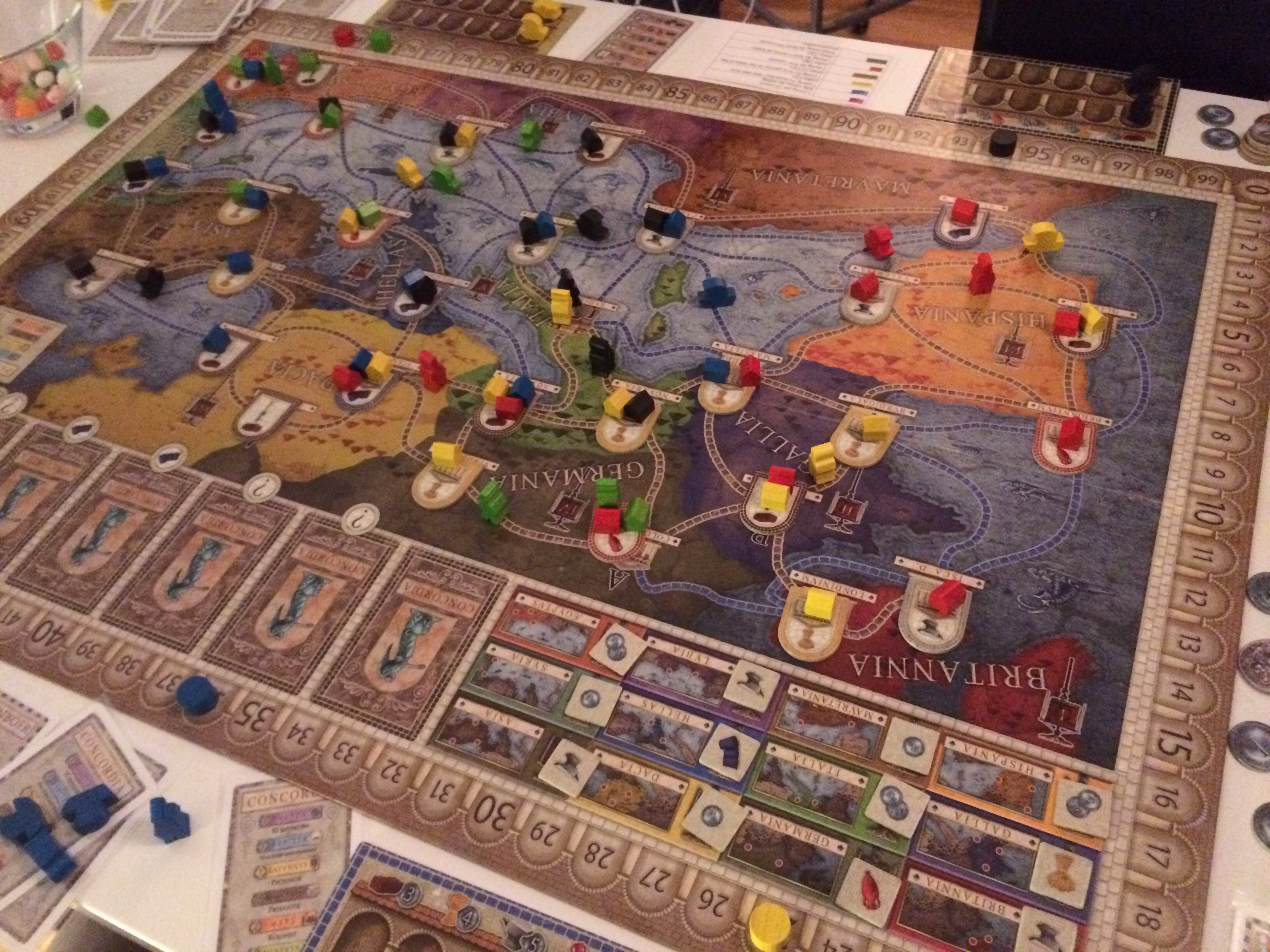 mange kolonister og skaffet seg flere marskort som gir poeng for nettopp disse. Concordia gir egentlig lite innblikk i hvem som ligger godt an hvis man ikke følger nøye med hvilke kort den enkelte samler. Men eget arbeid krever såpass mye fokus at det ikke er lett å huske hva andre gjør. Et kort som ble ganske nyttig ut i spillet var diplomat som spillerne brukte til å kopiere både konsul, arkitekt og kjøpmann. Pift avsluttet spillet og fikk så 7 poeng. Hollender fikk stort sett bare poeng for mercurius og venuskort, men når man har mange av en sort kan det ble mange poeng. Peter hadde sine provinskort og noen minervakort. Vegard scoret godt med minervakort, men hadde ellers lite. Pift hadde mange poeng for sine marskort, men også ellers ikke så mye. Mark hadde litt av hvert. Concordia ble godt likt også denne gangen.