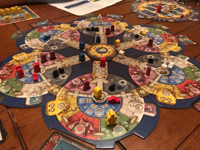 Så ble det et godt gjensyn med spill som ikke kommer så ofte på bordet. Peter, Kate og Hollender satte opp Aquasphere. Kate hadde aldri det før. Den første runden er det mye å sette seg inn i og ikke minst huske. Tross mange detaljer er spillet oversiktlig og handlingene er godt beskrevet. Hvor man forventet en tett strid var det en spiller som ledet hele spillet. Kate spilte solid og kapret poeng her og der. I tillegg hadde hun krystaller som man trenger til å passere lasere på poengskalaen. Peter slet litt mer med dette. Etter 4 runder var spillet slutt og Kate forsvarte sin ledelse også etter sluttskåren.