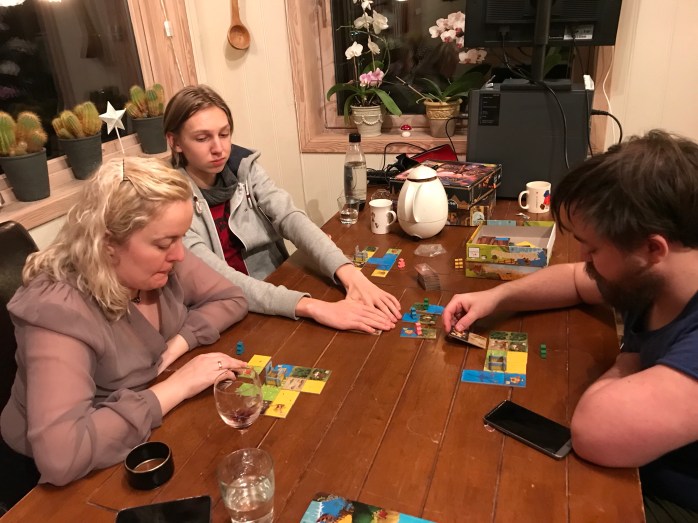 På det andre bordet hadde Siri først spilt en runde Splendor med Vegard og Noorullah. Splendor er alltid lettest når man kommer i flytsonen. Siri var der nå og vant lett. Etterpå fikk hun tre menn med på Hanse. Det ble mye kniving om varene og havnene. Spillet fløt godt og reglene var let å forstå. Trond Petter stakk av med seieren.