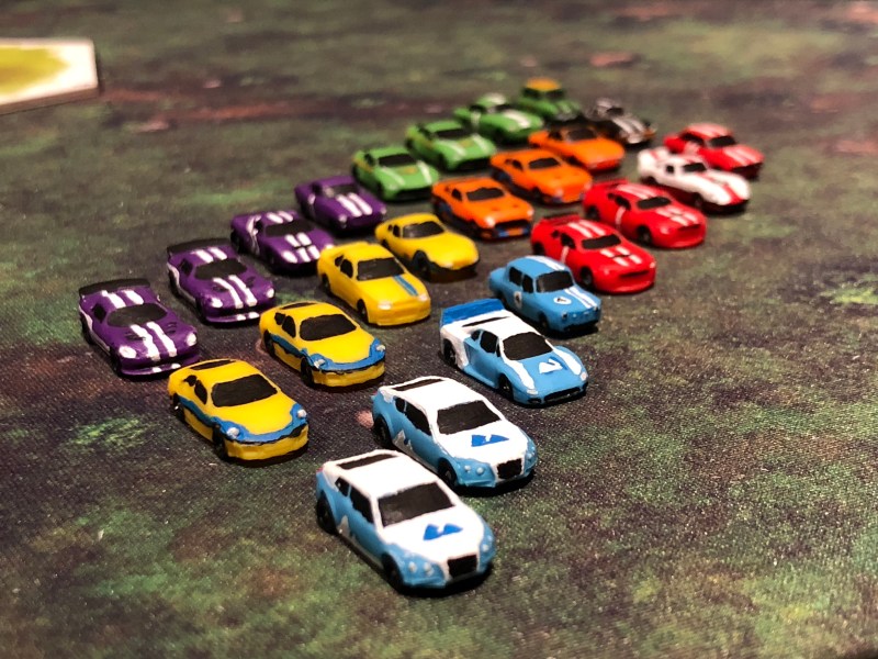 I bildet over er det rød sin tur, siden den er i høyest gir. Den ligger godt posisjonert inn i svingen og holder giret sitt med hvit terning, bremser hardt ned til første gir idet den passerer blå bil og tar den optimale linjen inn i neste sving. Spennende mange muligheter.