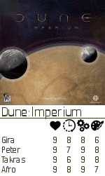 Dune Imperium er og blir et fantastisk engasjerende spill. Det er kanskje ikke det mest spenstige brettet å se på, men det gir igjen på å være funksjonelt og lett oversiktlig. Kveldens spillere ga spillet 9-er på totalen. Hva som ikke gir det den siste 10-eren er ikke godt å vite. Kanskje litt mye venting.