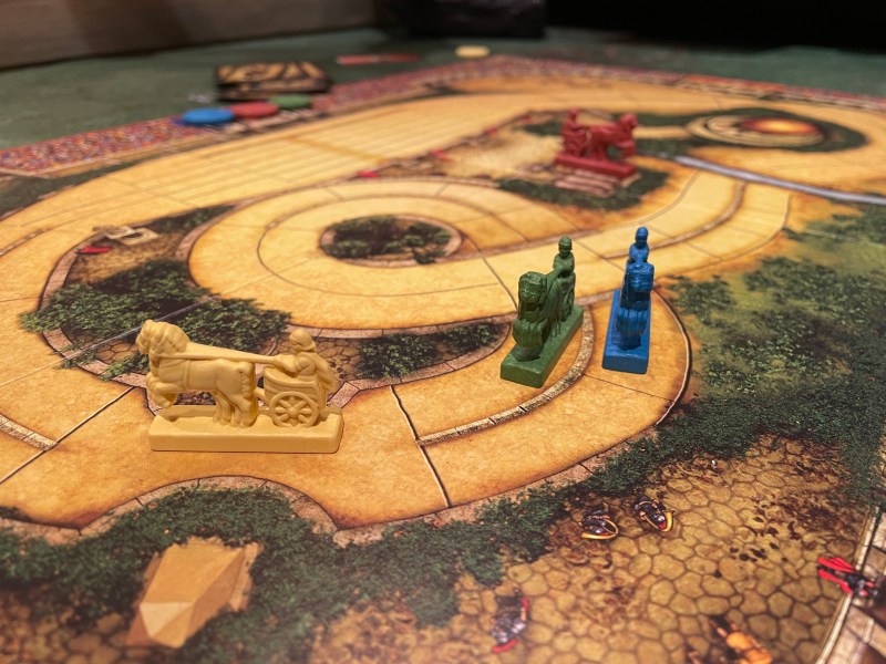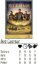 Spillet tok kun 2 timer med fire spillere, og da har vi faktisk brukt ganske lang tid. På tide med en enklere dessert. Flamme Rouge-elsker Gira var klar for et annet type racingspill, nemlig Ave Caesar! En ikke-ukjent flamme i PG.