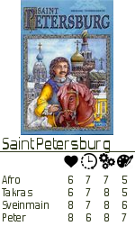 Mange interessante valg som må gjøres i Saint Petersburg og det er tydelig at det lønner seg å ha kjennskap til spillet. Afro følte seg litt som fisk på land, men kom inn i det etter hvert. Det kanskje vanskeligste er å spare penger fra den røde fasen, gjennom utviklingsfasen og tilbake til den grønne fasen igjen. Den er ikke så intuitiv, men skaper mange vanskelige situasjoner og spennende valg.