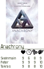 Vi spilte i 2.5 timer, pluss en time med oppsett og regler. Men Anachrony var et solid spill, som Peter til og med sammenlignet med Power Grid i kvalitet. Man får ikke bedre skryt enn det. «Tiden fløy», sa Sveinmain og ga karakter 5 av 10 på tidsopplevelse… Begrunnelsen var hvor lang tid man måtte ha hjernen på høy-aktivitet for spillet, men alle var enige om at det var et bra spill.