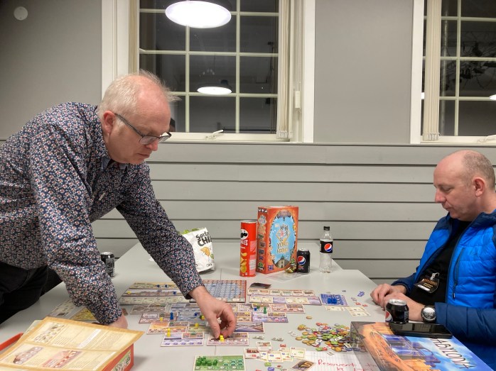 Vi var 5 stk og Sveinmain hentet inn de 5er spillene han hadde med. Gjertrud hadde lyst til å spille Nusfjord, og så ble det, selv om det var litt sent for en Uwe Rosenberg-tungvekter. Litt regler å forklare, men de satt brukbart. Når de var ferdigforklart, hadde Magnus fått nok for kvelden – kan skjønne det etter en lang spilledag. Derfor var vi 4 igjen.