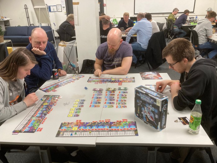 Etter Frisbeen ble det en matpause, før jeg plukket opp Terje og kjørte til Slakthuset igjen. Der møtte vi Gjertrud, Gustav og Magnus som skulle spille SpaceBase. Vi spurte om vi kunne joine, og som alltid i Haugesund – seff var svaret.