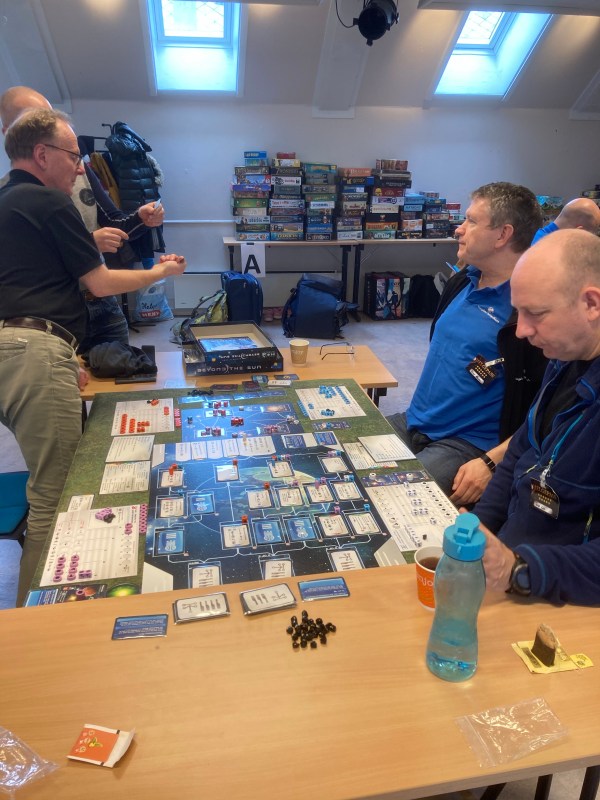 Søndag: Einar hadde Beyond the Sun klart når vi ankom lokalet. Terje klokket Einar inn på 15 minutter regelforklaring som han hadde lovt oss det skulle ta, selv om ikke alle hadde alt klart etter de 15 minuttene. Men etterhvert så han ting veldig godt sammen i spillet.
