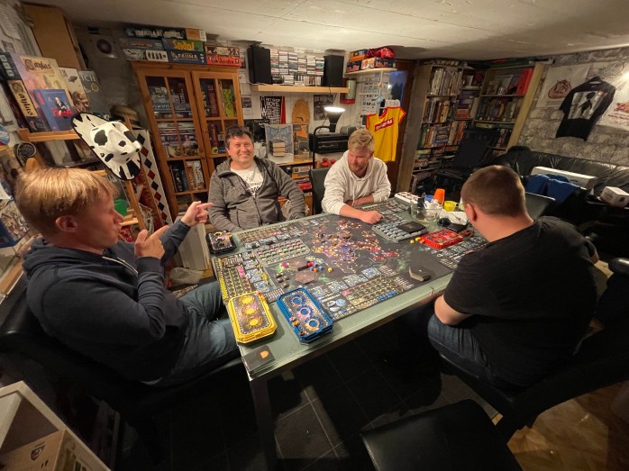 Takras hadde forberedt reglene godt og å sette opp spillet var en fryd. Så mye stash og så mange komponenter. Alle fikk hver sin farge, og kunne velge mellom menneske hvor alle hadde standardegenskaper, eller å snu brettet og få ulike startoppsett. Sveinmain, Kjell Henrik og Øystein valgte «human» mens Vegard og Takras valgte baksiden med dertil annerledes oppsett.
