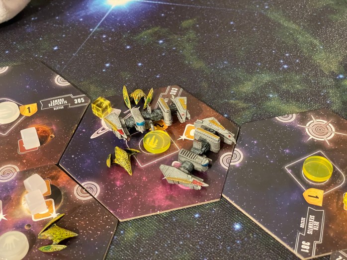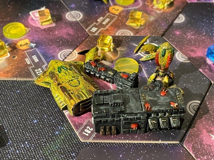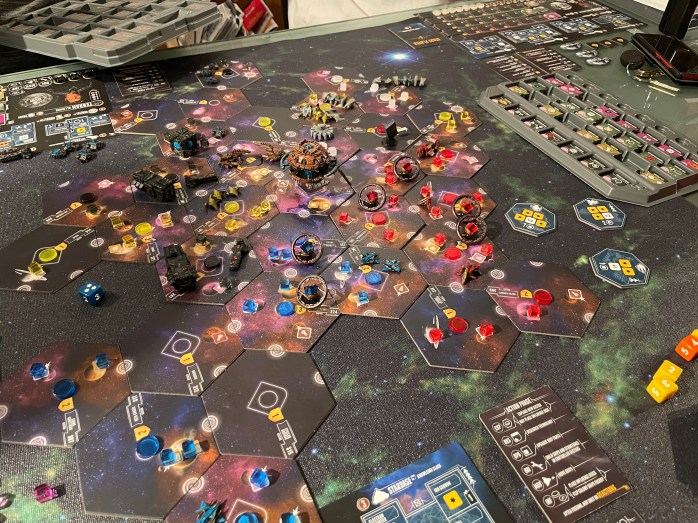 Så var det bare å sette i gang. Mye å forholde seg til, men Vegard og Sveinmain bygde begge 2 av sine minste romskip, og med noen spill-romskip som naboer, så satte de inn hvert sitt angrep tidlig. Begge tapte så det suste, men skulle de det? Etter noen runder fant vi ut at miniromskipene skulle ha angrepet først, og ikke spillet sine romskip. Men ikke mye å gjøre med det. Brettet fyltes opp da en kan utforske, bygge romskip, flytte romskip, oppgradere og et par ting til å velge mellom.