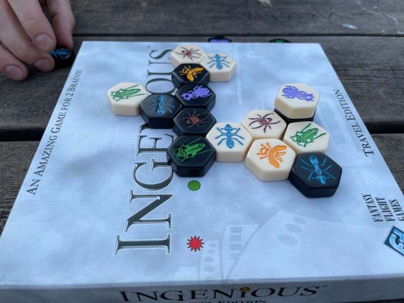 Etterpå fant vi frem en klassiker, med brikker som tålte litt vind. Reisespillet Ingenious, eller ganske enkelt Genialt på norsk. En Knizia-perle hvor det man har minst av er det som gir poeng. 1. Afro 9, 2. Takras 8