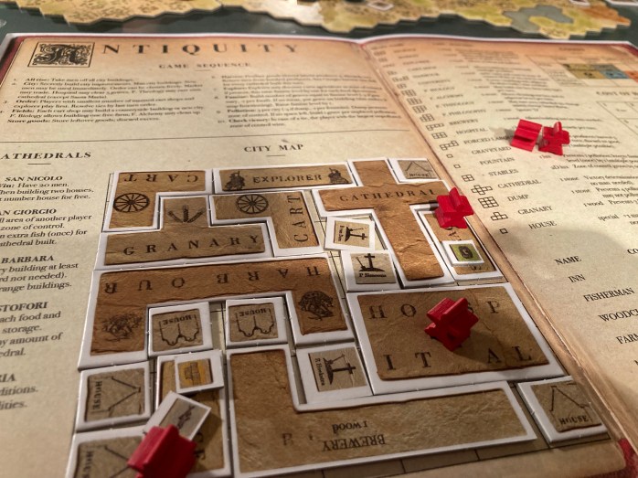 Så til hovedretten – Antikken eller rett og slett Antiquity. Spillet som strekker seg over 600 år eller noe sånt, og foregår både på egne brett og på hovedbrettet. Graham forklarte igjen reglene utmerket, og svarte på mange spørsmål før underveis og også etterpå. Her skal vi alle utvikle vårt tetrislignende brett, og en bør fylle opp med bare bygninger en trenger. En skal så hente ut arbeidere for å betjene disse og også til å utvikle ens rike på brettet. En må høste skog, fiske, og dyrke jorda for å få mat og luksusvarer som en igjen kan bytte inn i nye bygninger, arbeidere eller skaffe seg en ny by på brettet. Så sagt så enkelt. Men underveis i spillet kommer det forurensning og død, med graver som tar plass på brettet ditt. Kombinerer du dette med sinnsykt vanskelige «goals» eller seieirskriterier som det kalles på norsk, så har du spillet i et nøtteskall.