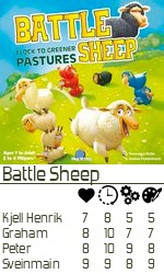 Battle sheep er passe kort, passe dumt og passe brutalt for en slik setting. Mye latter og sukk og stønn. Kan det bli bedre? Alle var livredde for å få sauene sine sperret inne på enga, og Kjell Henrik var den som hadde mest kontroll på saueflokken med å få alle sine ut. 1. Kjell Henrik 16, 2. Peter 15, 3. Graham 15, 4. Sveinmain 15, men sisteplass.