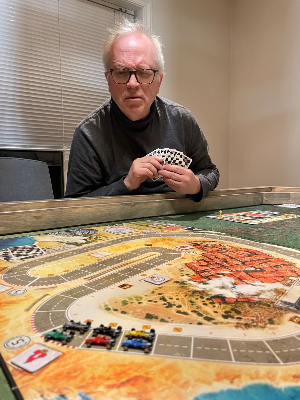 Sveinmain holdt det godt i ledelsen, og med oss i kveld hadde vi to ekstra biler styrt av AI-kort. Erik var først ute med motorhavari i den første svingen på andre runde, og det satt ham nesten helt ut av spill. Peter måtte (han sa han måtte) gamble flere ganger og endte opp med å haverere i den skumle 1-er svingen som også genererte ekstra varme (vi spilte med ekstra harde regler i kveld).