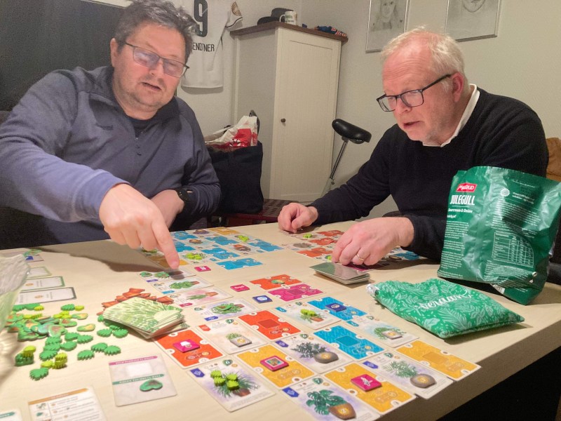 Så til en av årets nykommere – Verdant. Her skal vi dyrke planter og få rom som gir de riktig lys. Rom og lys skal legges i et bestemt mønster, og har du rom og planter som er samme sort, og gjerne et møbel i rommet samtidig får du godt med poeng. Kjell Henrik og Peter klarte dette godt, mens Sveinmain fikk aldri opp rom som passet til plantene sine. Spillet var krydret med gjødsel, tomler opp, spader og river. Men det var mye logistikk. Nye kort opp, nye tomler på brikker og nye brikker opp av sekken. Men vi klarte å holde kontrollen og når alt var ferdigspilt så hadde ingen kontroll på hvem som hadde vunnet. Utregningsarket var langt, men etter hard regning av Kjell Henrik, så var det Peter som vant med 85 poeng, foran Kjell Henrik 79 og Sveinmain med 75.