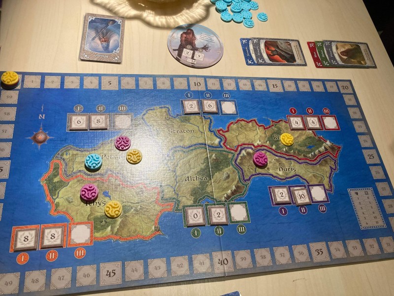 Først ute var Ethnos, fra 2017 og et BGG topp 250 spill. Vi trakk ut 6 klaner av 12 som skulle fylle brettet, og dermed så har dette spillet stor variasjon da hver klan har sine fordeler. Ikke ulikt Ticket to ride(TTR) var reglene rimelig enkle. Trekk ett kort eller legg ned et band of Brothers(BOB). 6 områder på brettet skulle besettes, og de gav fra 0 til 10 poeng alt etter hva brikken på området sier.