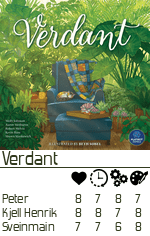 Verdant er nok like kjekt for blomsterelskere som Wingspan er for fugleelskere. Mye detaljer og ekte planter, flott bladfigurer var ikke nok til å overbevise alle. Hakke svakere enn Ethnos til 7,7 i snitt av 10 viser likevel at spillet har kvalitet og fungerer godt.