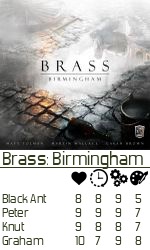 Knut hadde på forhånd annonsert Brass Birmingham – spesialflydd inn til Jørpeland fra Oslo for anledningen. Han, Black ant, Graham og Peter ble med. Her skulle det først bygges kanaler i en æra før lokomotivene tok over. I tillegg skulle det brygges øl om jeg ikke tar helt feil og dette skulle fraktes rundt på spillet. Svart eske, svart brett og dystre farger krever litt godt lys, i tillegg til god plass selvsagt. Graham spilte nesten på hjemmebane, selv om han var oppvokst et godt stykke unna, men vet ikke om han fikk med seg en seier eller ei. Men uansett så var spillet godt likt, og vil nok komme på bordet igjen.