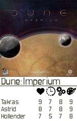 På samme bord, litt lengre på enden havnet til slutt Astrid, Takras og Hollender og skulle spille sci-fi spill. Hollender er nesten allergisk mot slike spill, men ble lovt at Dune var et deckbuilding-game hvor det skulle samles inn krydder og erobres planeter eller noe slikt. I tillegg skulle det utkjempes kamper og skaffes innflytelse på ulike områder. God stemning også blant de 3, og Hollender klarte å holde konsentrasjonen hele spillet igjennom isteden for å spille rollen som traitor, som han fort havner i i slike spill.